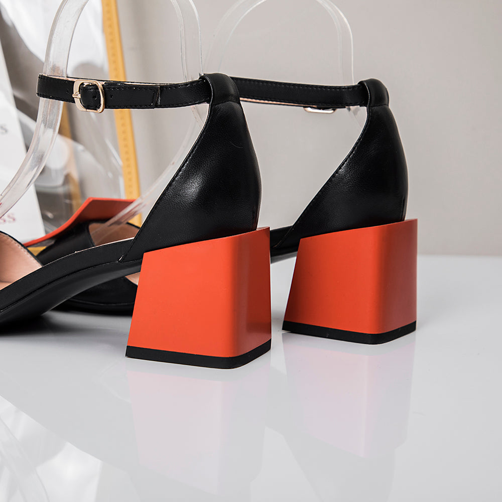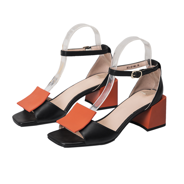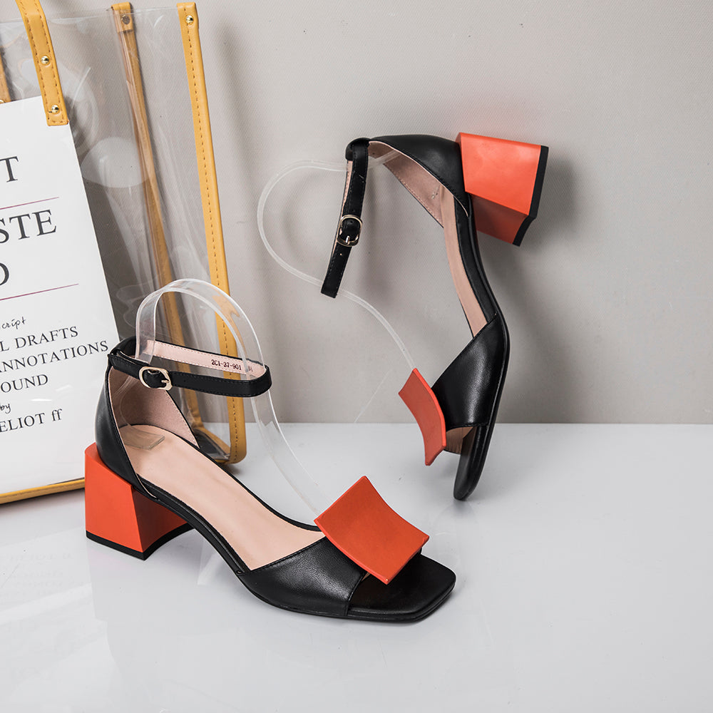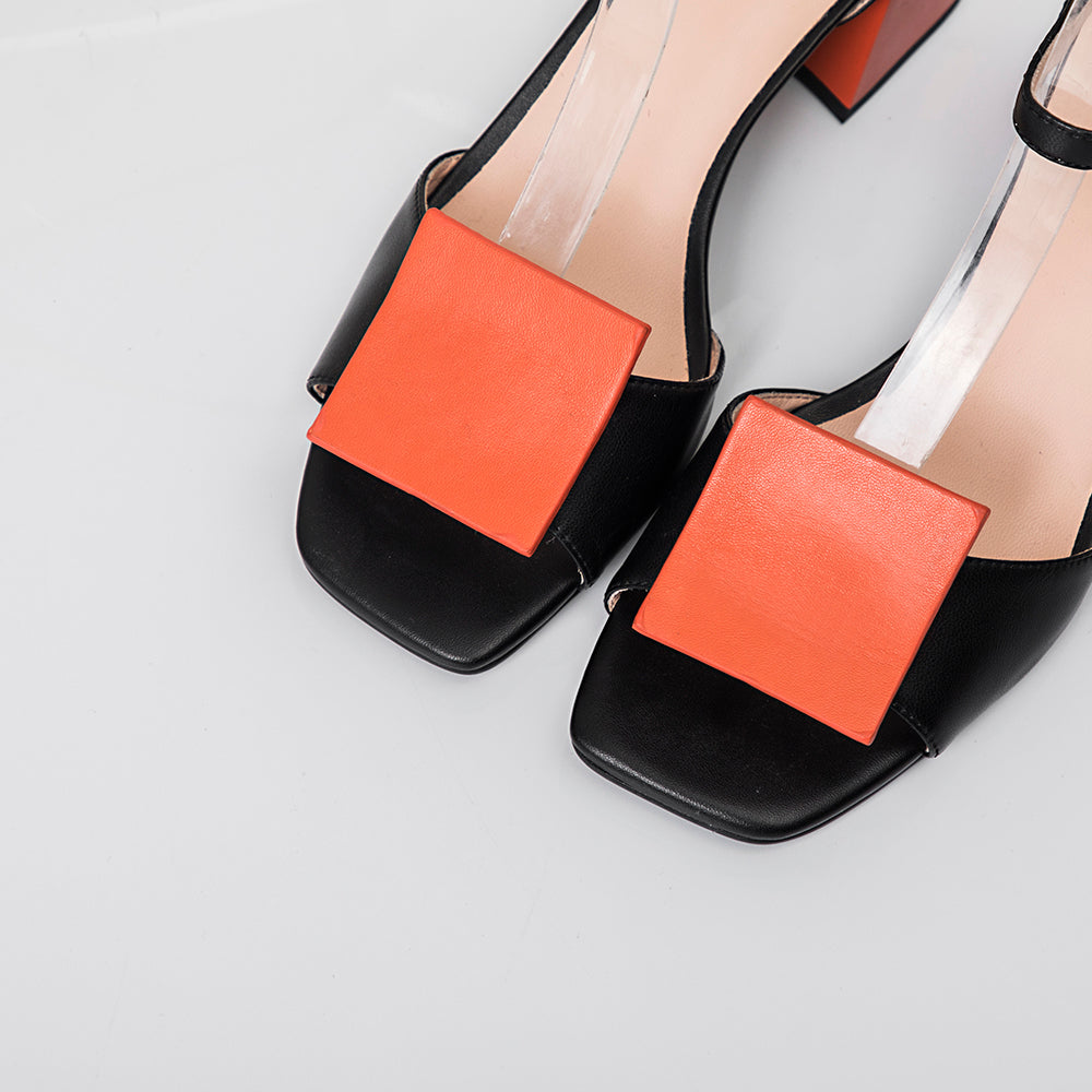 Solid Genuine Sheepskin Leather Sandals with Chunky Heels, Square Shaped Applique Decoration, and Ankle Strap Closure