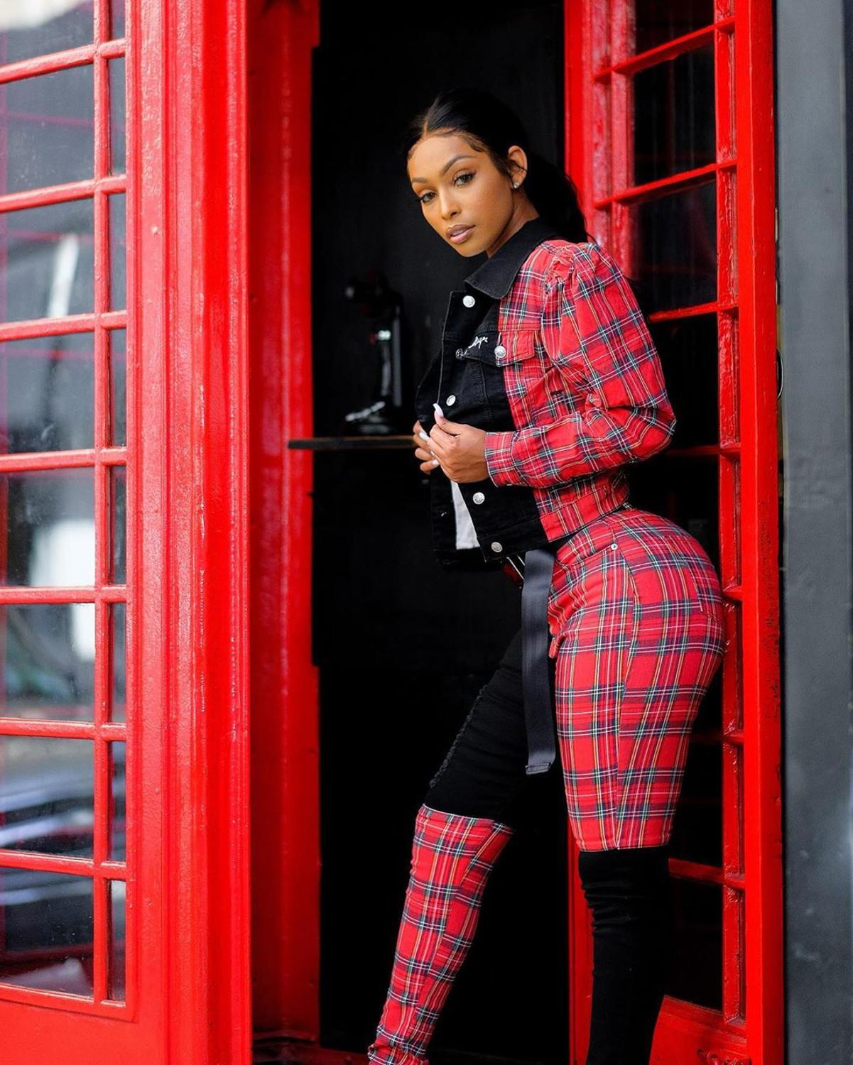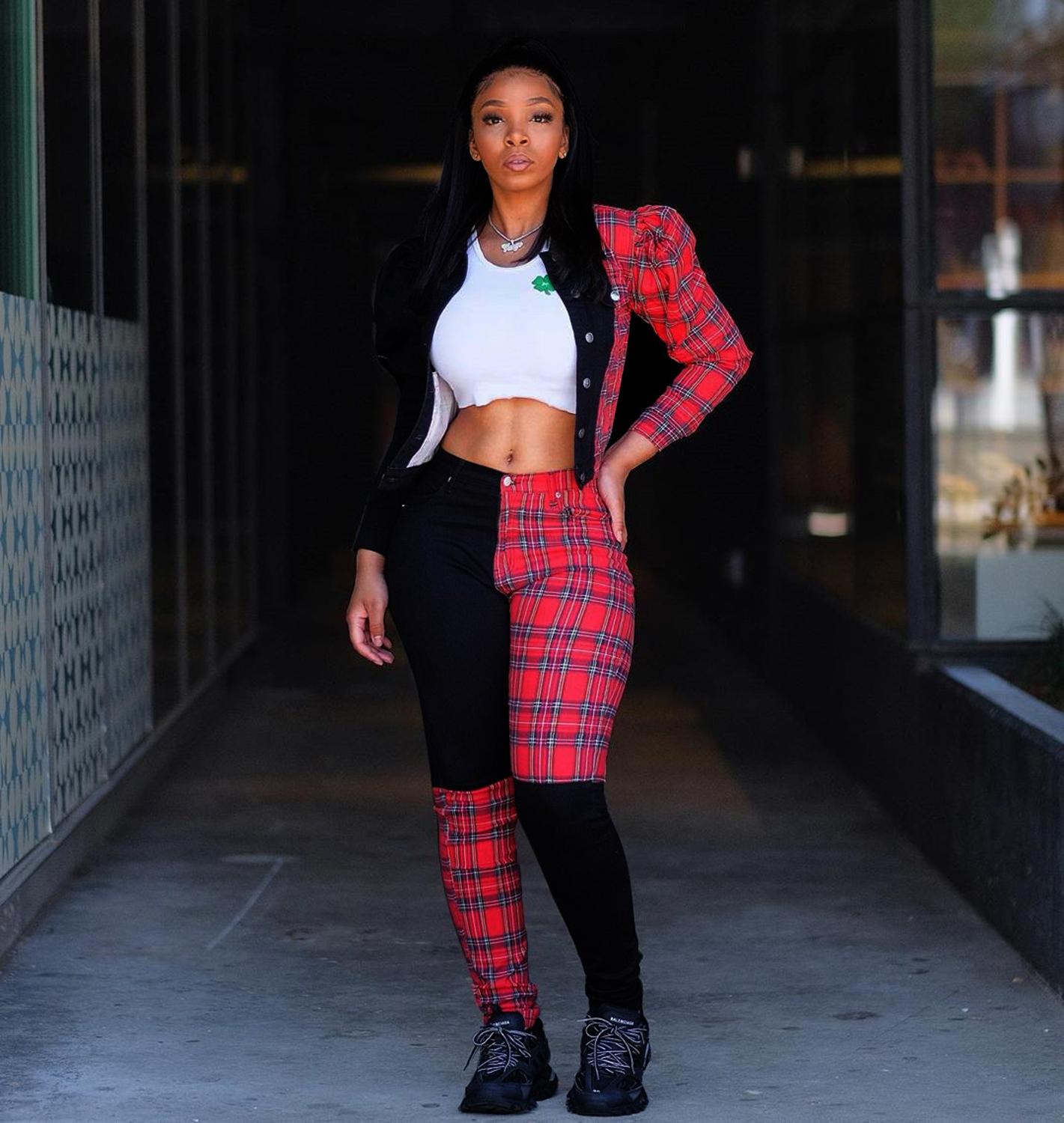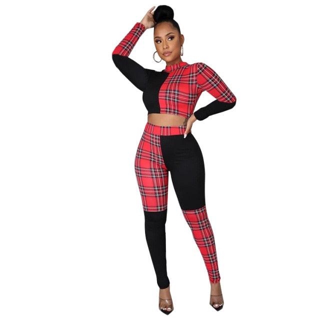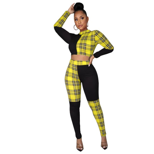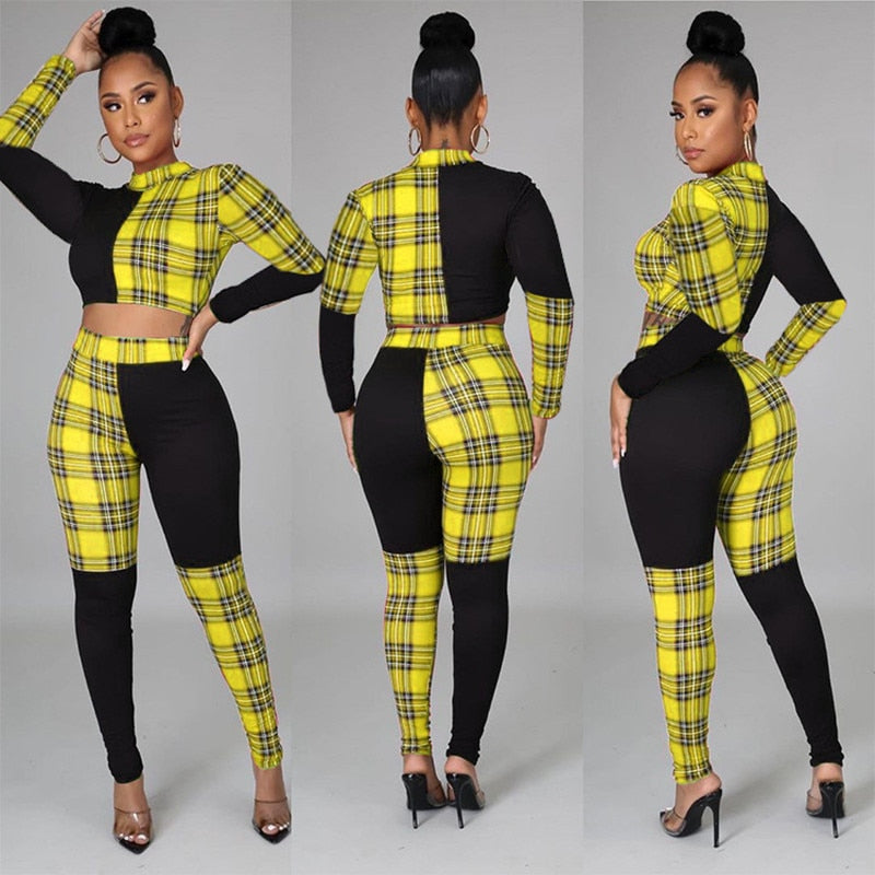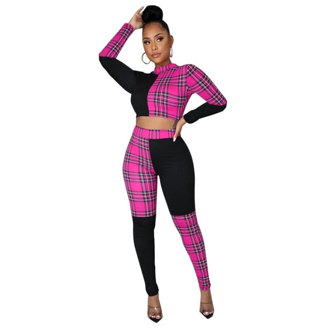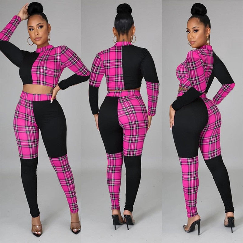 This pants set has a combination of plaid pattern and solid color to make it look like a patchwork. The top long-sleeved crop top with a stand collar. It is available in 2 styles and 3 colors.