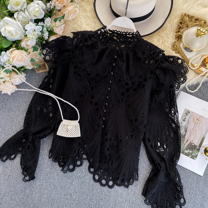 Hollow Out Geometric Pattern Blouse with Flounce Sleeve and Stand Collar