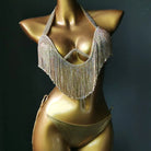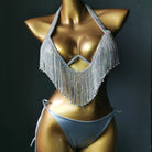 The Kiss The Sunrise Bikini combines sleek spandex with eye-catching tassels and sparkling rhinestones for a bold beach statement. Designed to highlight your confidence, it hugs your curves while dazzling under the sun, perfect for turning heads and owning every sunrise moment.