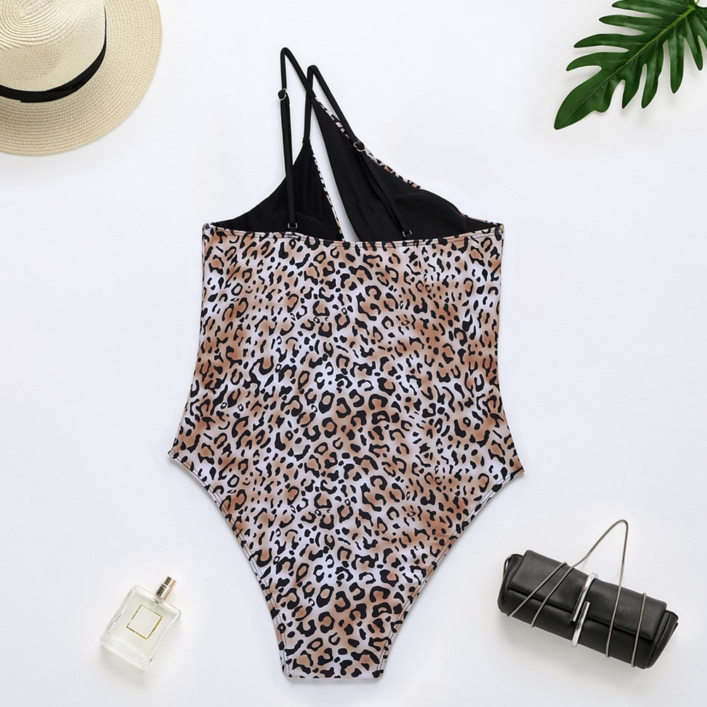 One-Shoulder Polyester Spandex Monokini with Leopard Pattern