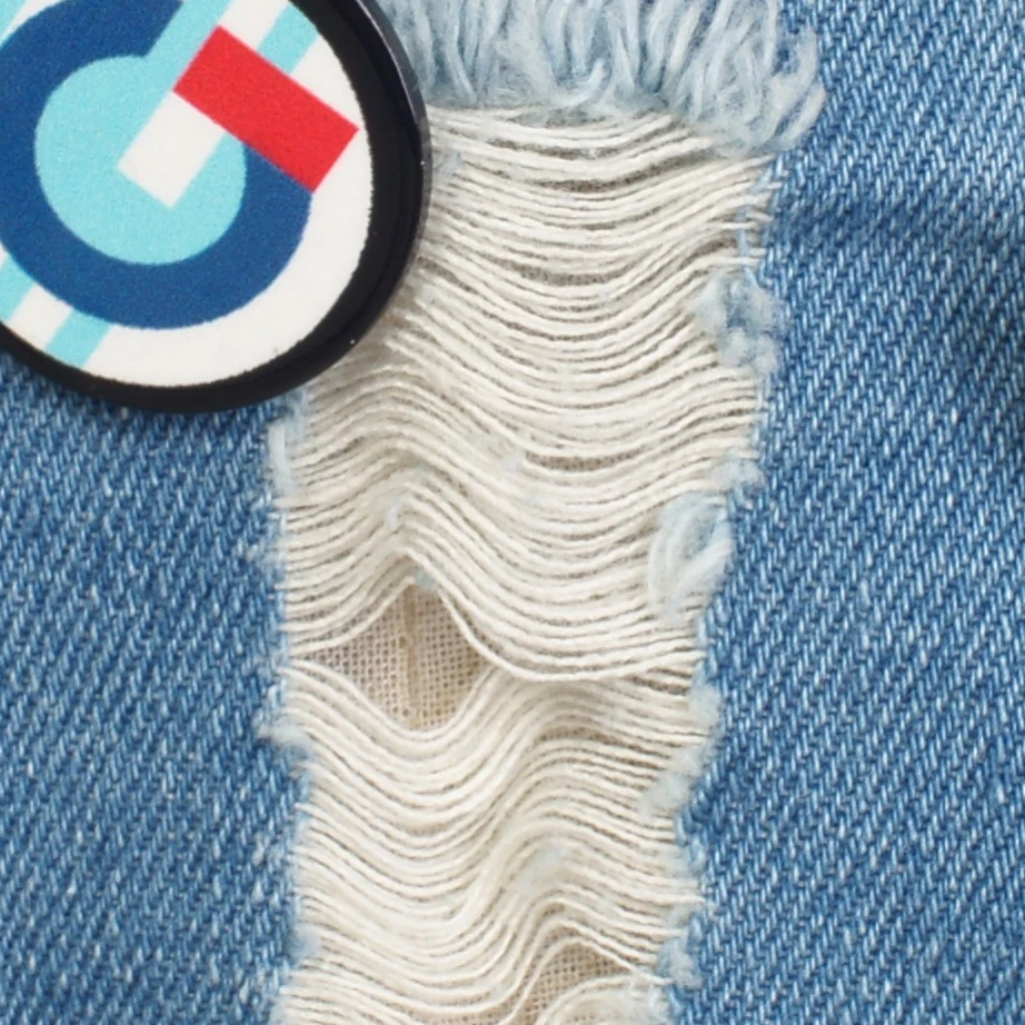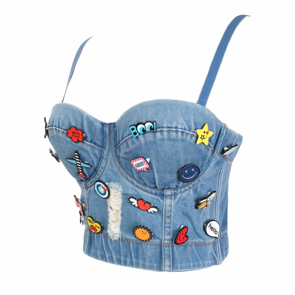 Solid Sleeveless Acrylic Denim Polyester Spandex Camisole Crop Top with Pins Appliques Decoration