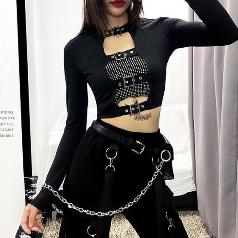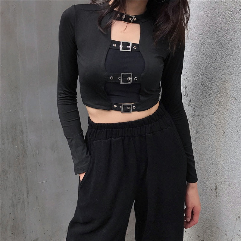 Long Sleeve O-Neck Collar Cropped T-Shirt with Hollow Out Decoration and Cotton Polyester Material