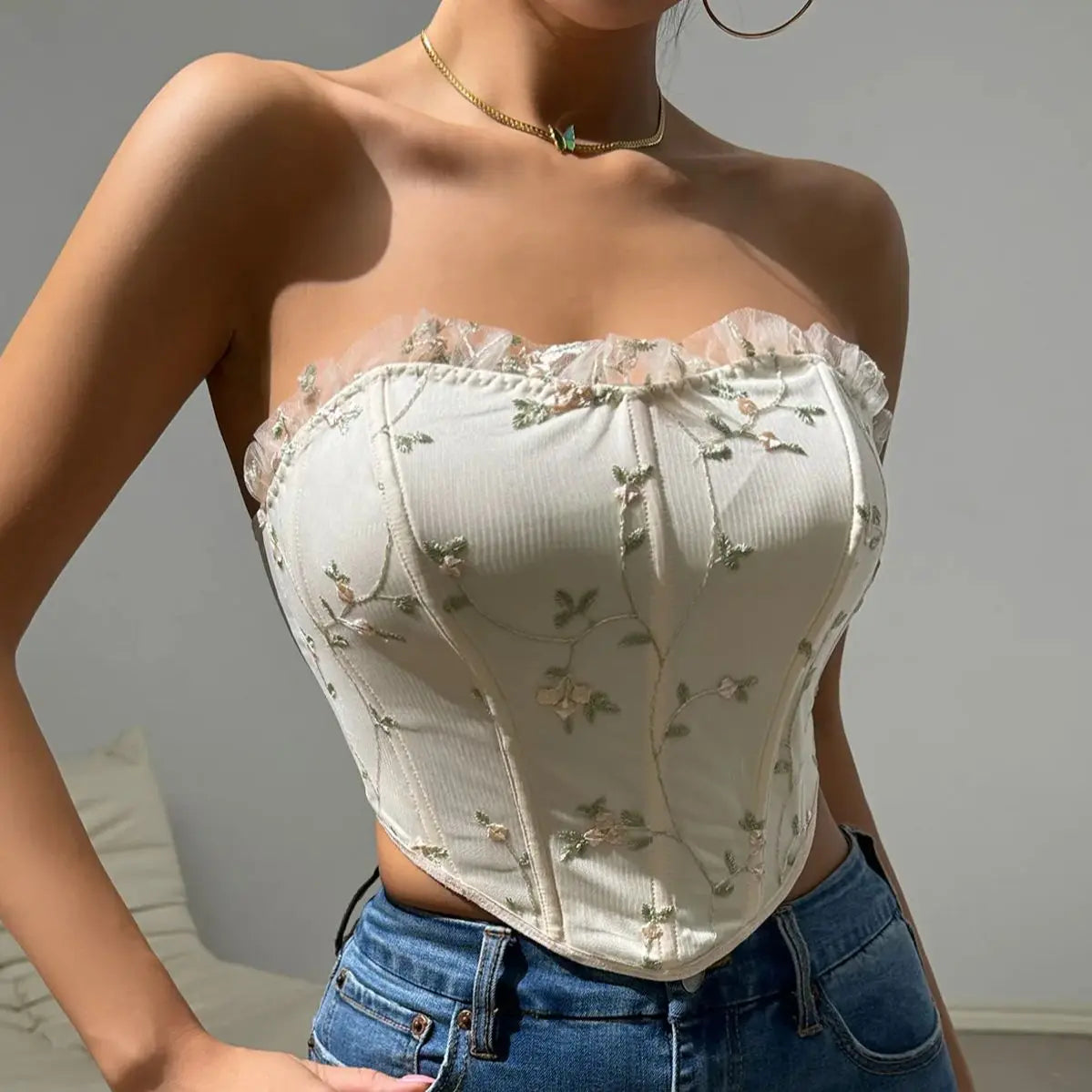 Elevate your summer style with our bustier! Crafted from soft polyester and spandex, this tank features beautiful floral embroidery for a touch of feminine flair. Perfect for any adventure, this tank will keep you cool and stylish on even the longest of journeys.
