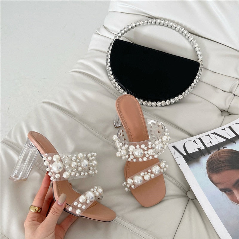 These sandals are the perfect summer accessory for anyone who loves to make a statement with her footwear. The chic and stylish design with the double PVC straps and unique heel style makes them a go-to choice for all occasions. The pearl beads also add a lovely look to your outfit.