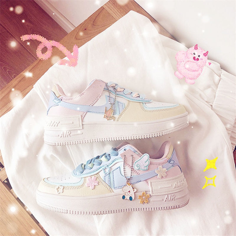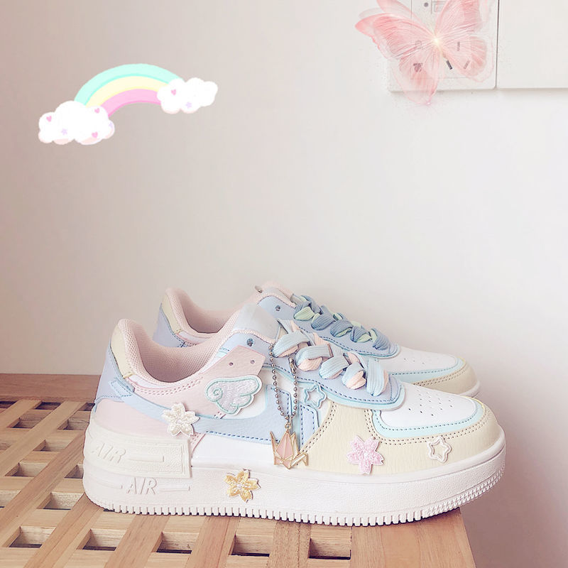 Add a little flair to your outfit with these electric, eye-catching, vibrant pastel rainbow sneakers. The upper is made of durable PU leather, the lining is made of cotton, and the insole is made of fabric. The thick rubber sole gives the shoe both style and traction function.