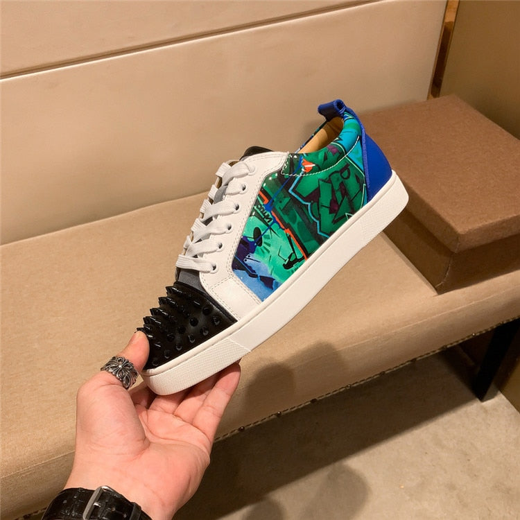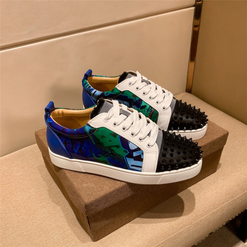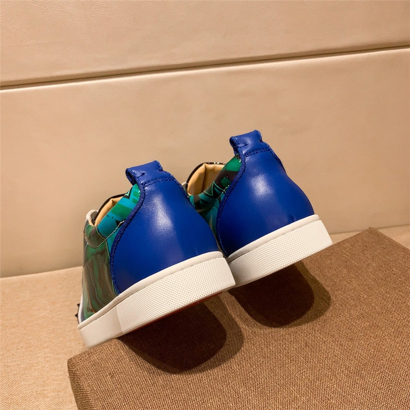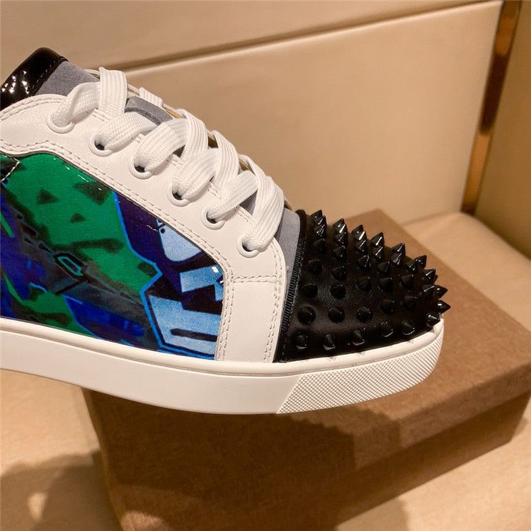 Get ready to take on your day in these trendy, stylish, comfortable women's sneakers. These lace-up sneakers are made of genuine leather and PU material. The rivets are decorated with geometric patterns. The shoes are a must-have for your wardrobe.
