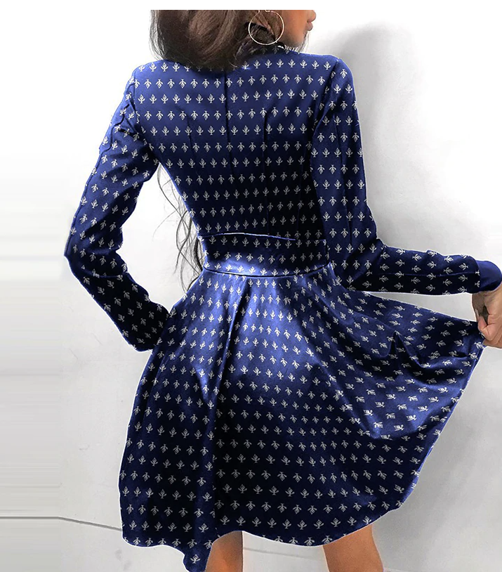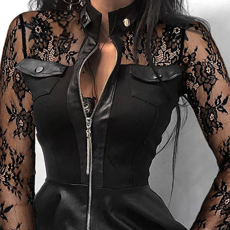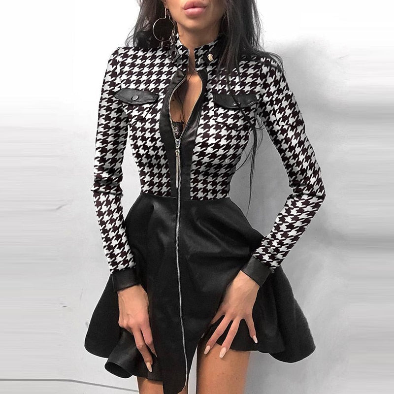 Stand Neckline Long Sleeve Mini Dress With Zipper Closure