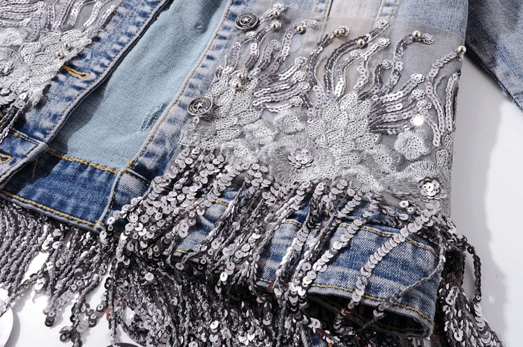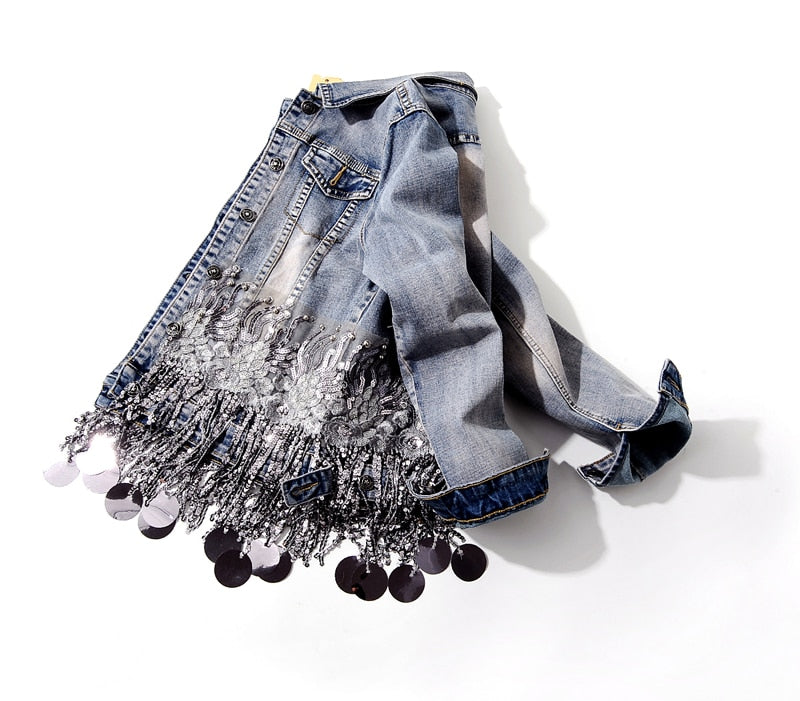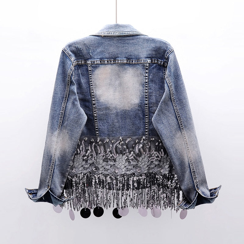 Polyester Cotton on Turn-down Collar Zipper Round Chain Denim Jacket
