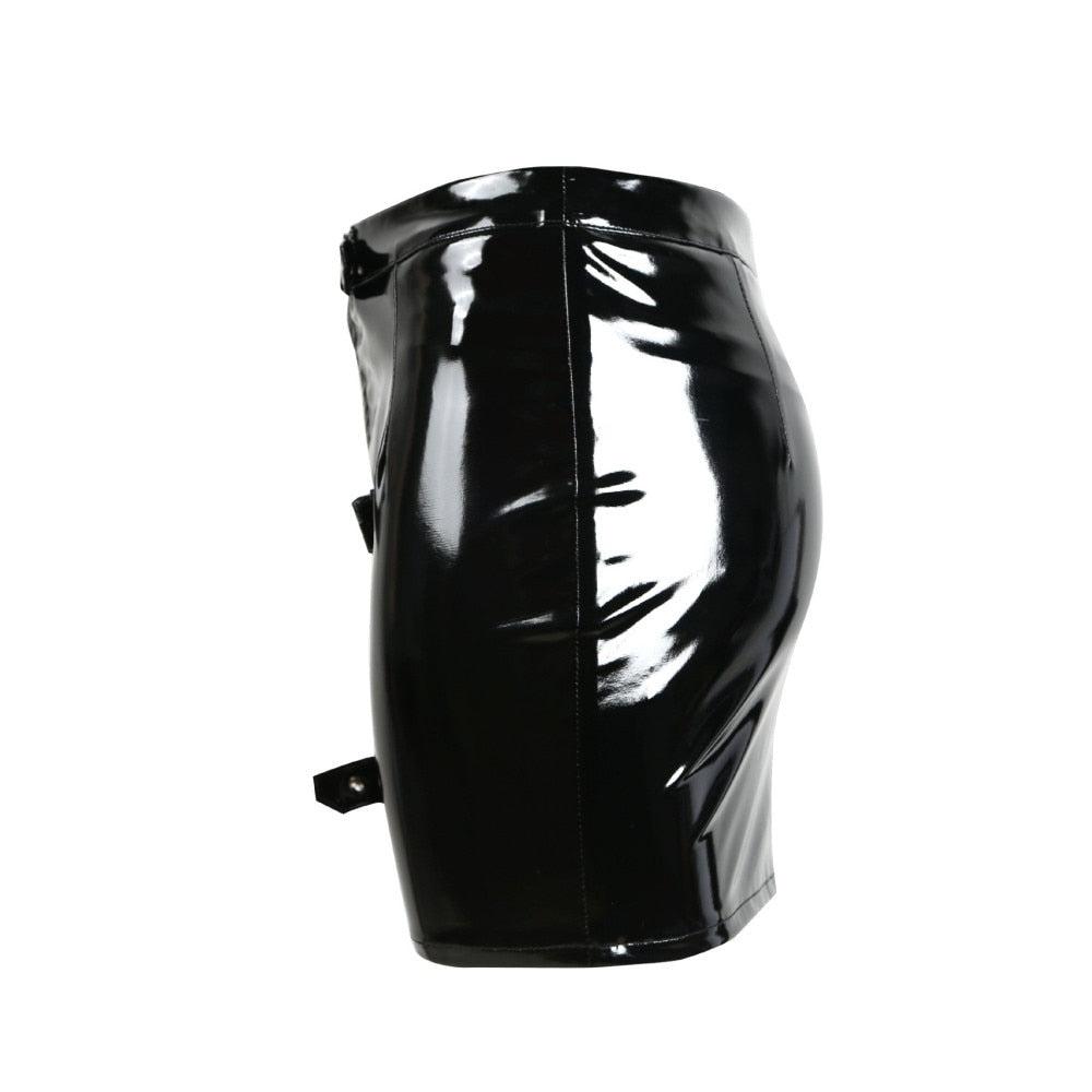 This stylish mini skirt is an adorable way to update your casual look for the warmer months. Featuring a casual buckle strap design, this skirt is a beautiful way to add feminine flair to your casual wardrobe. It's a stylish way to create a tailored look that coordinates with a wide range of outfits. Try this black glossy look skirt for a glam look that is perfect for going out. The trendy black color ensures that you can easily coordinate your outfit with a variety of looks. Zipper closure on the wide waistband allows for easy on-and-off