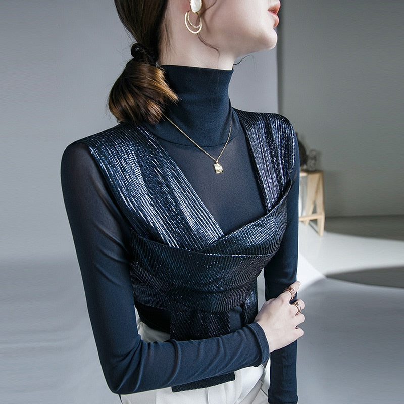 This stylish women's blouse is a versatile essential. Keep your look classic with the half-solid and half-geometric pattern. This polyester blend fabric is super soft and comfortable against the skin, making it ideal for casual wear. The turtleneck design is sure to become a staple feature in any fashionable wardrobe.