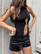 Sinful Rhythm Top Unleash your boldest self in this daring polyester-spandex blend that moves with you. The sleek solid design strips away distractions, letting your confidence take center stage. Crafted for those who refuse to play it safe, this top delivers comfort without compromise. Whether you're commanding a room or owning the night, this piece is your weapon of choice.