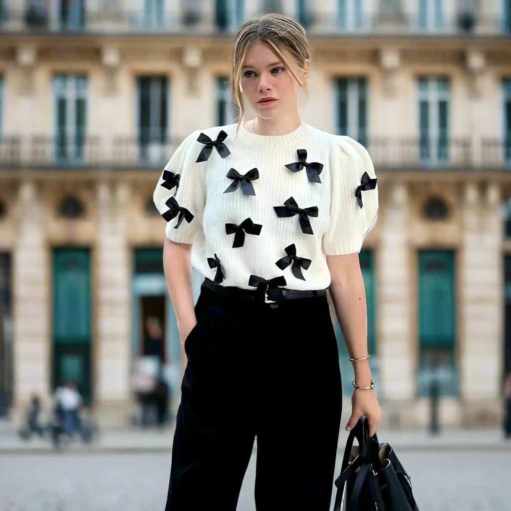 Add a touch of elegance to any outfit with our Whispering Pines Sweater. The short length flatters any figure, while the polyester material provides comfort and durability. A decorative bow and O-neck collar add delicate details. The medium stretch and puff sleeve style offers both comfort and style.
