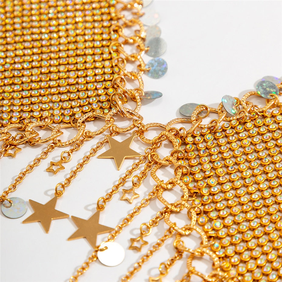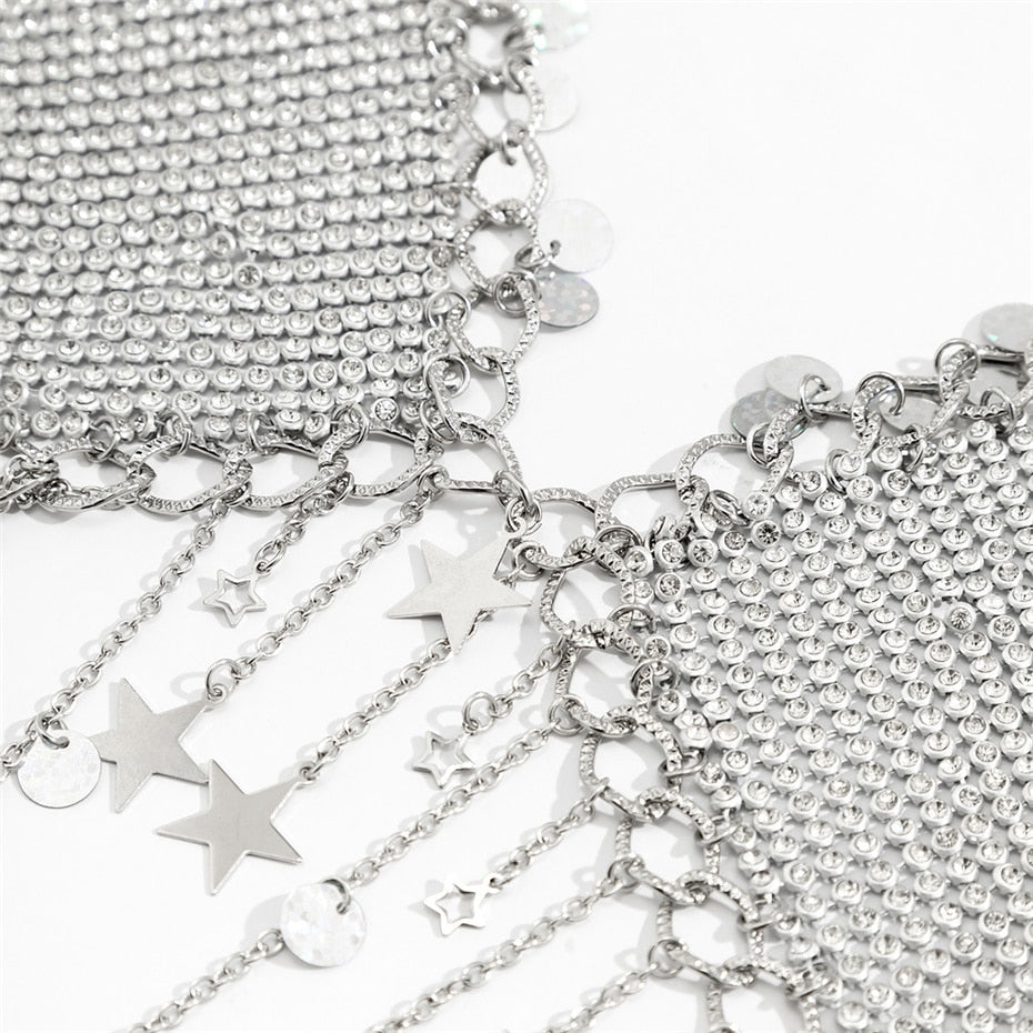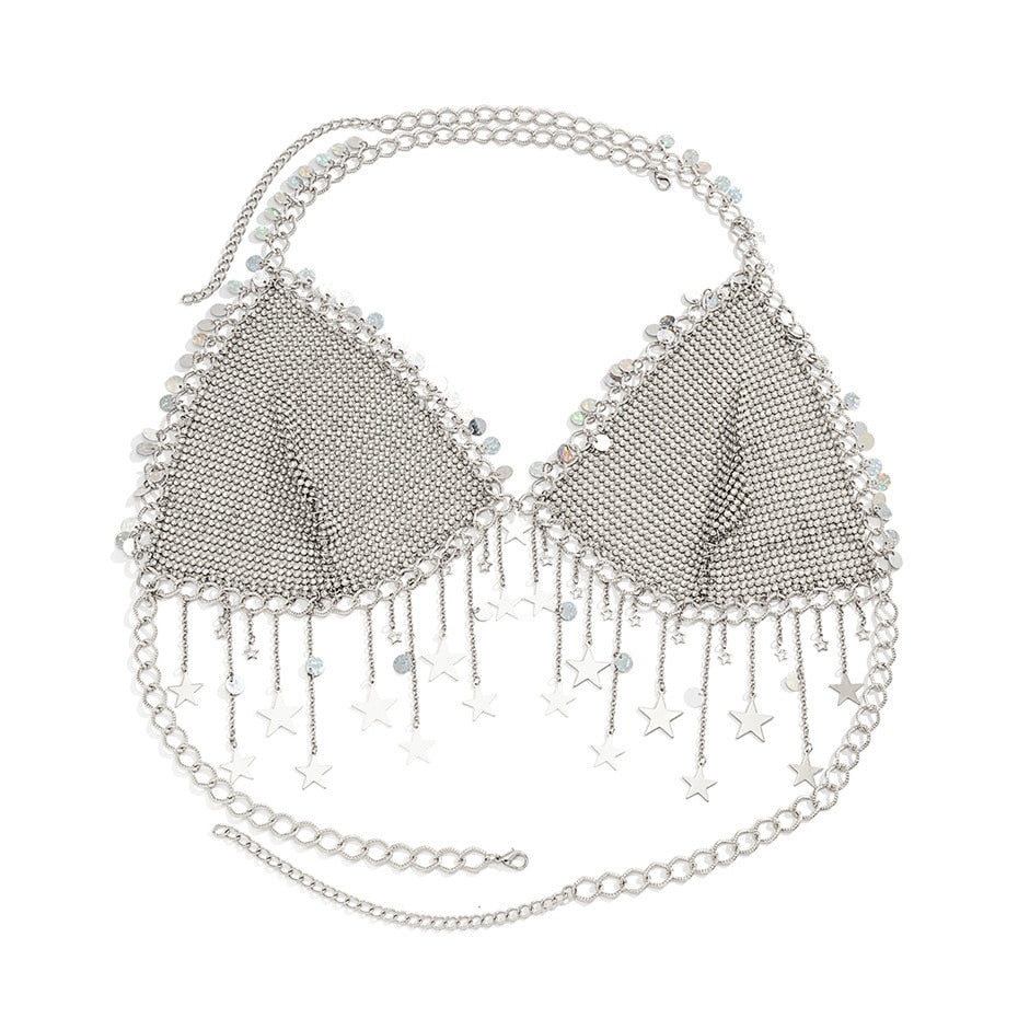 Elevate your look with this body jewelry. This uniquely designed bikini-style body jewelry features star-tipped tassels that add a touch of sophisticated elegance to your summer style. Shine with the stars and make a fashion statement with this luxurious body jewelry.
