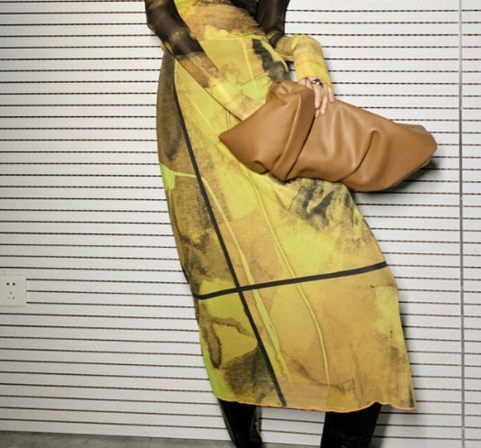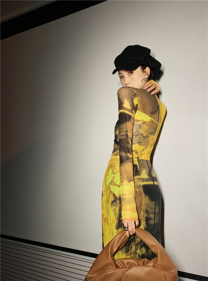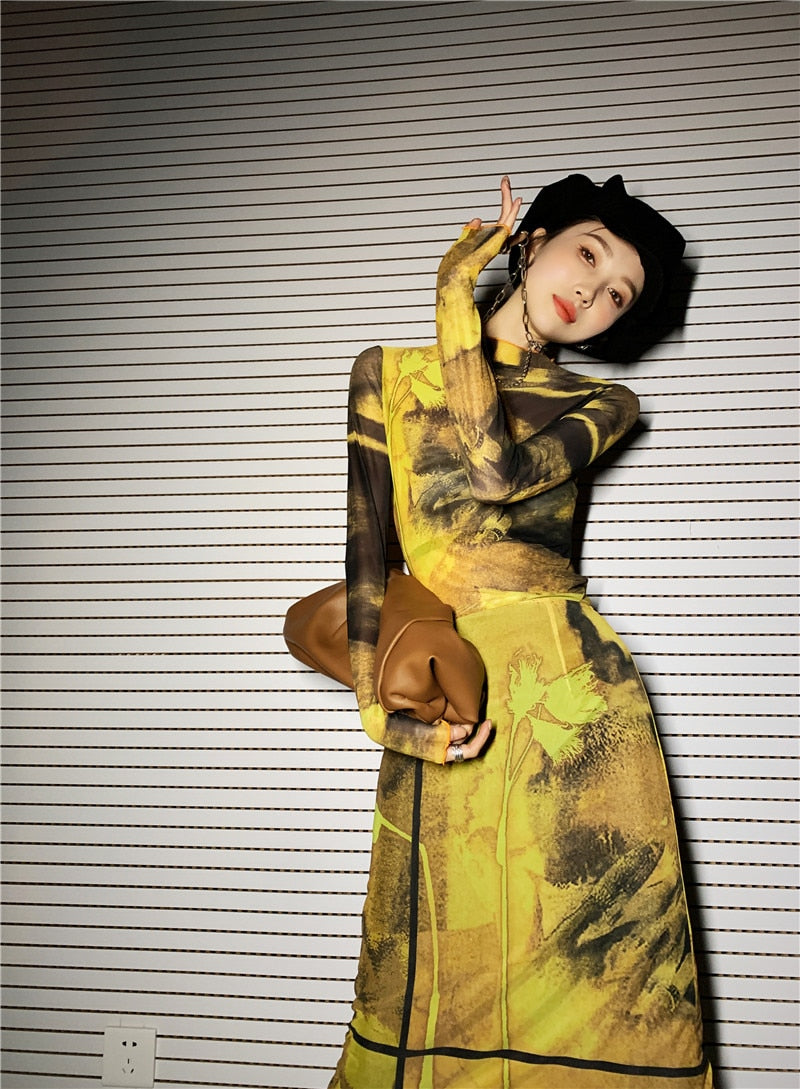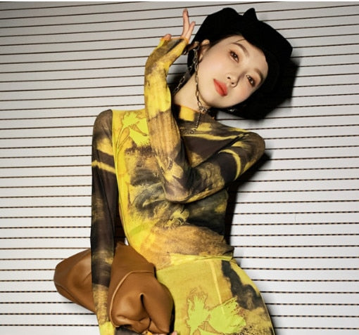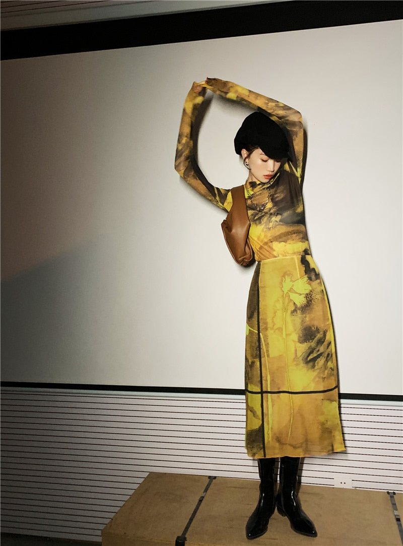 The skirt set is a two-piece set that includes a t-shirt and skirt. The top is long sleeve and features an o-neckline and the skirt is mid-length with a high waist design. The pattern is geometric and features black-yellow colors.