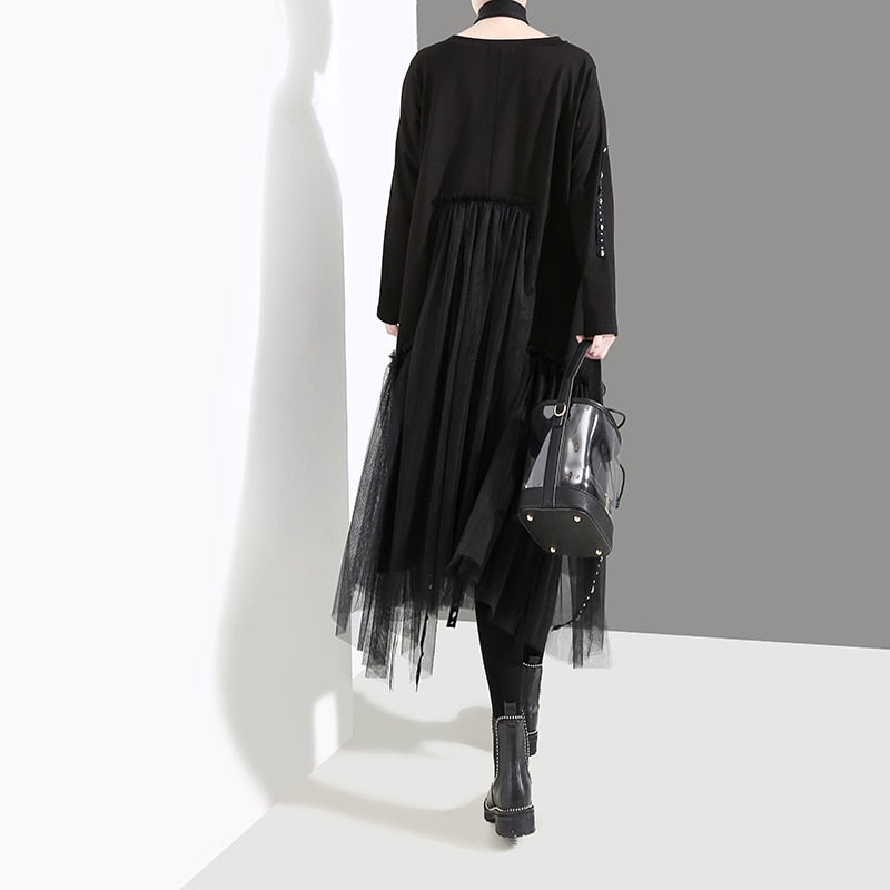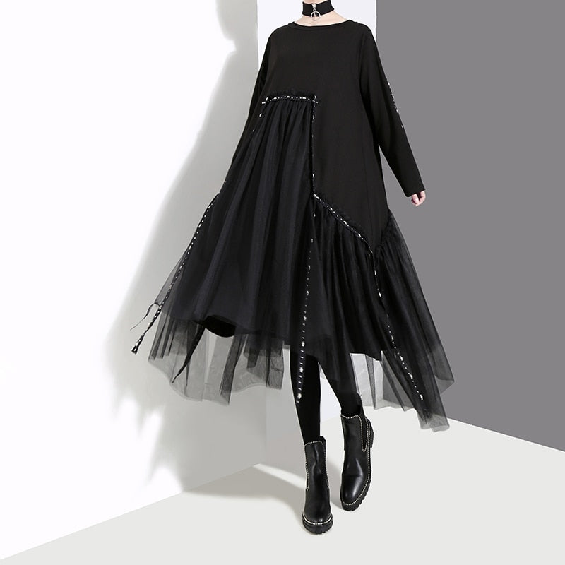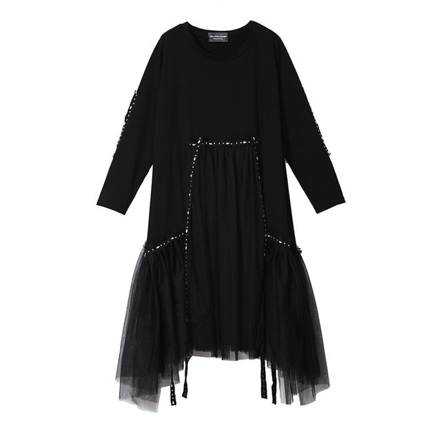 Mesh Acetate on Loose O-Neck Knee Lenght Midi Dress