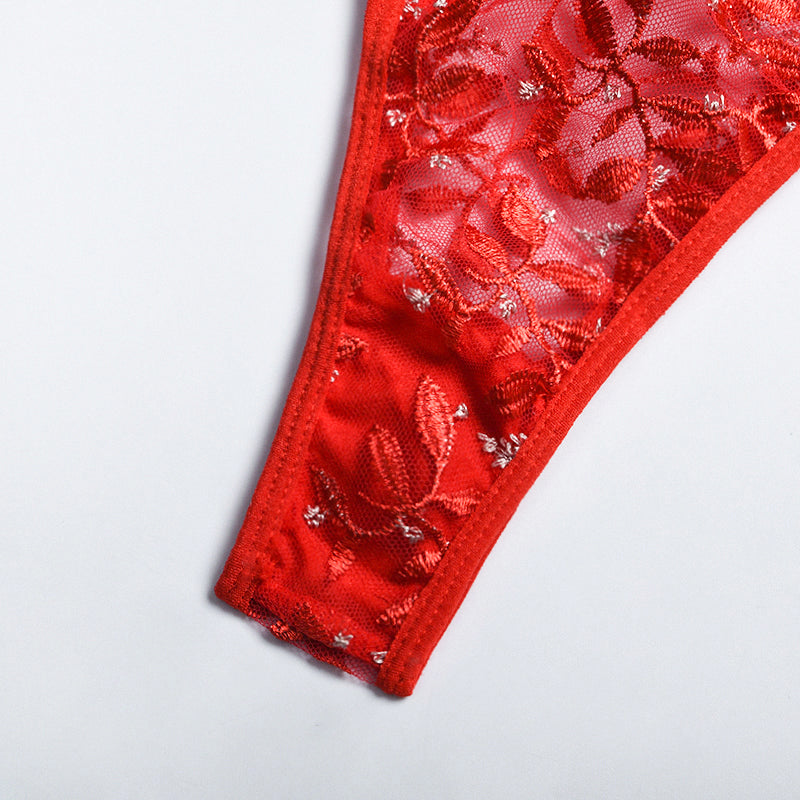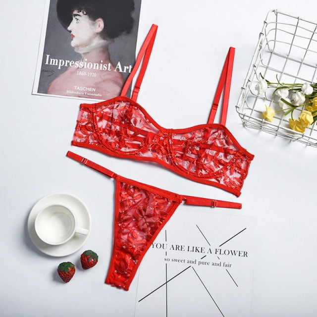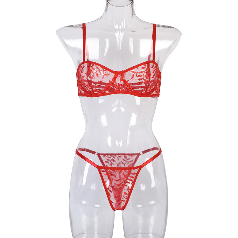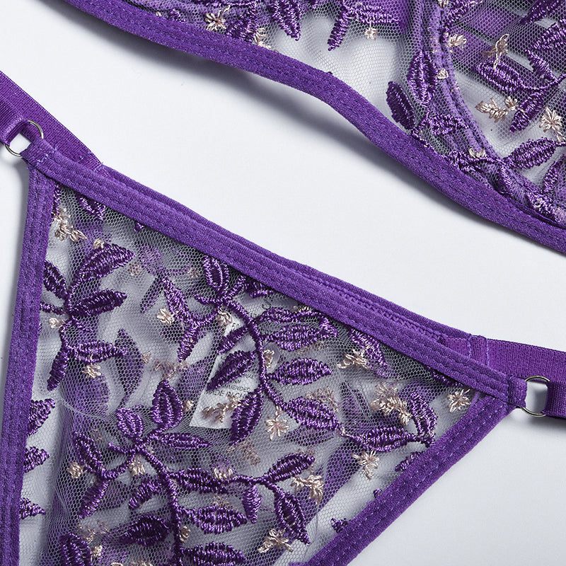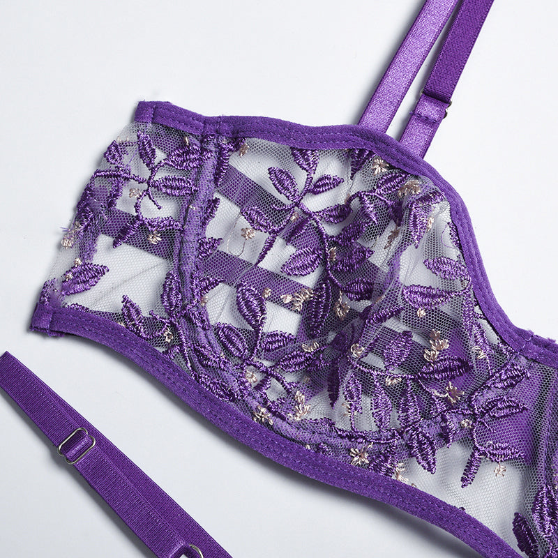Net Polyester Bra Set with Leaf Vines Embroidery
