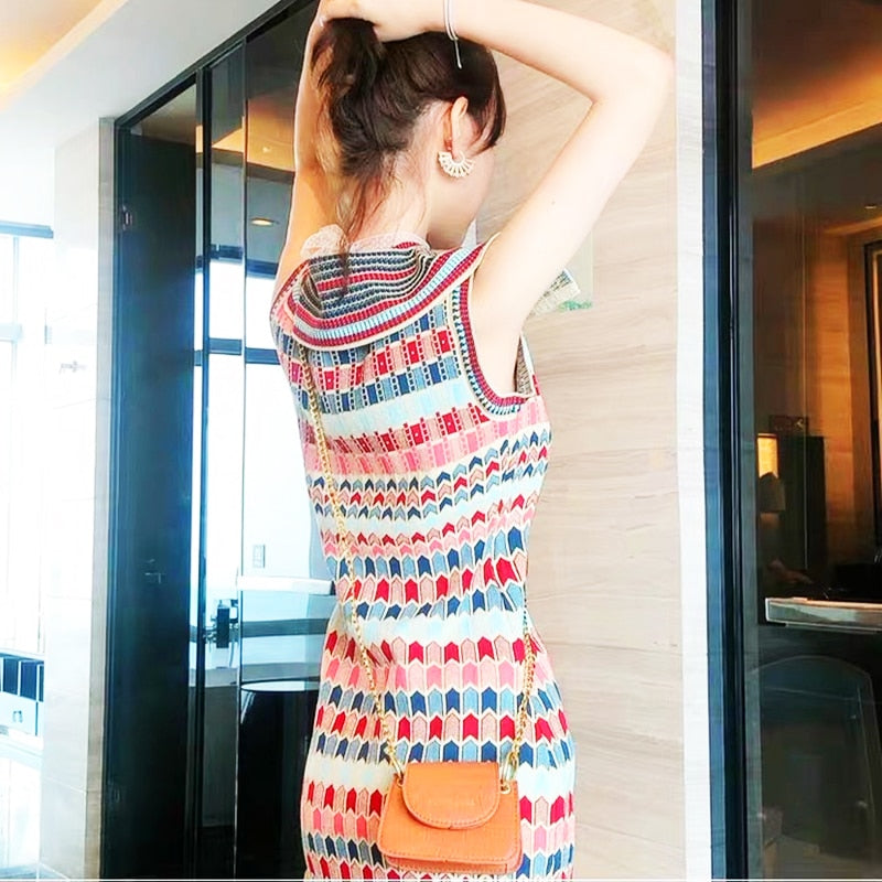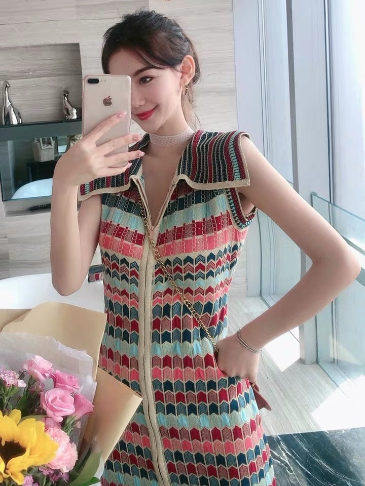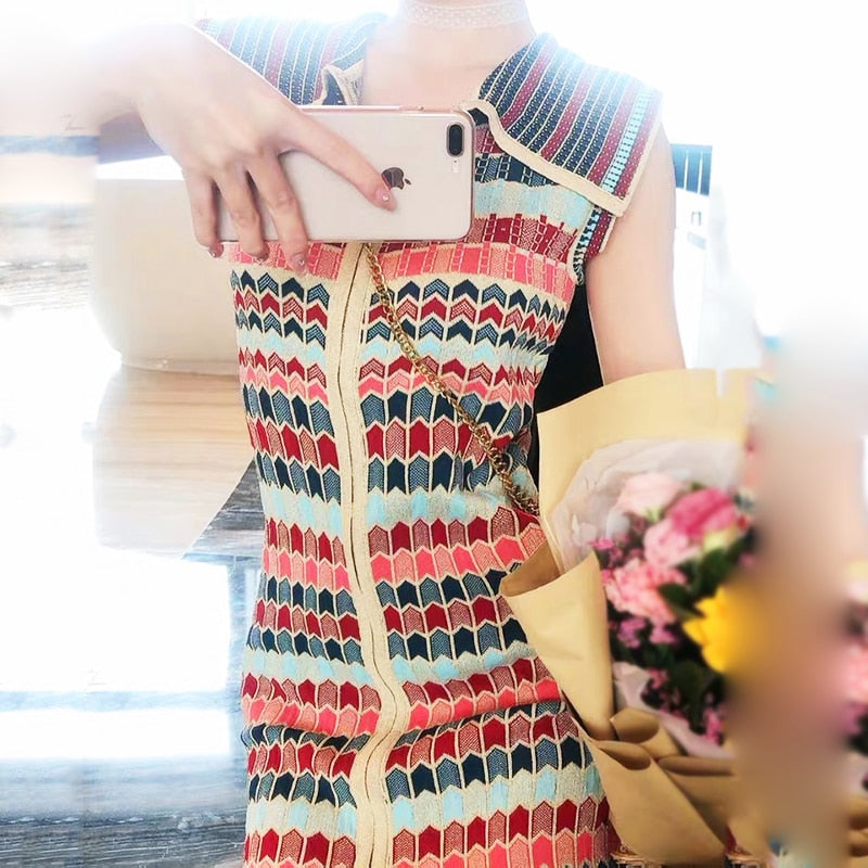 Colorful Geometric Pattern Mini Dress with Turn-Down Collar and Cotton Material