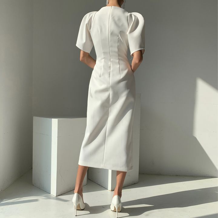 This stylish midi dress is the perfect choice for any occasion. Made from a comfortable polyester fabric that features a v-neck and short puff sleeves. The versatile style also works well with matching accessories.