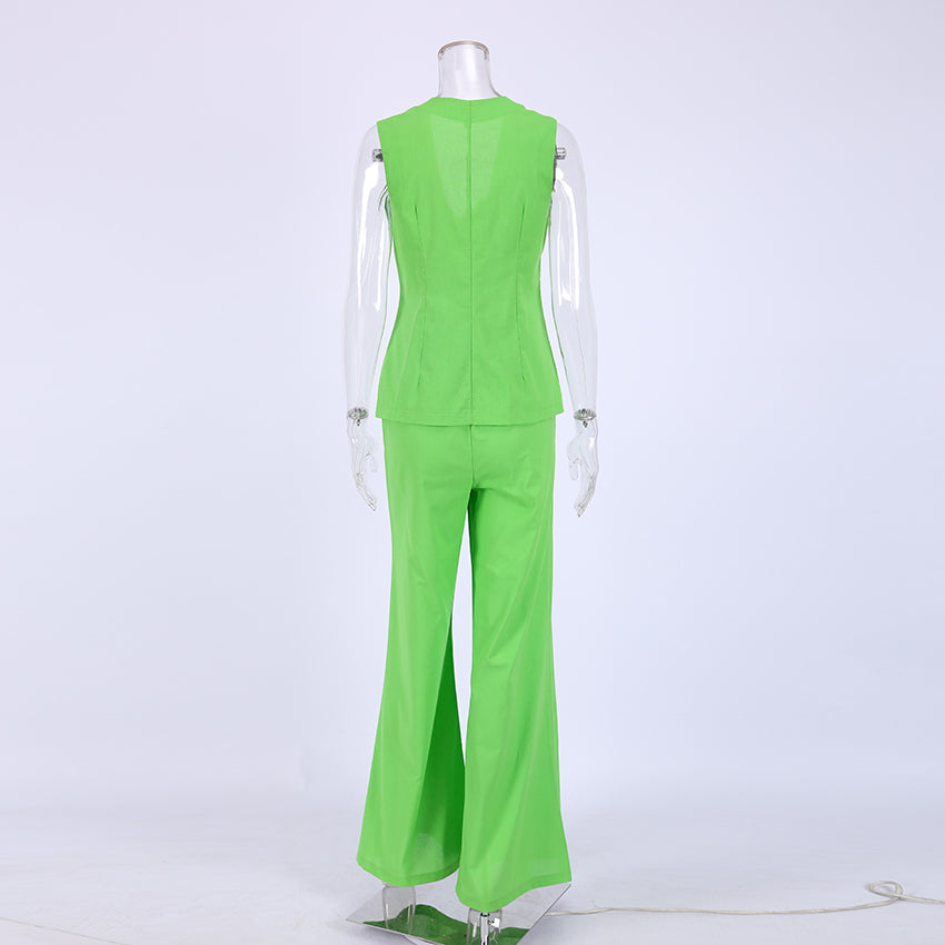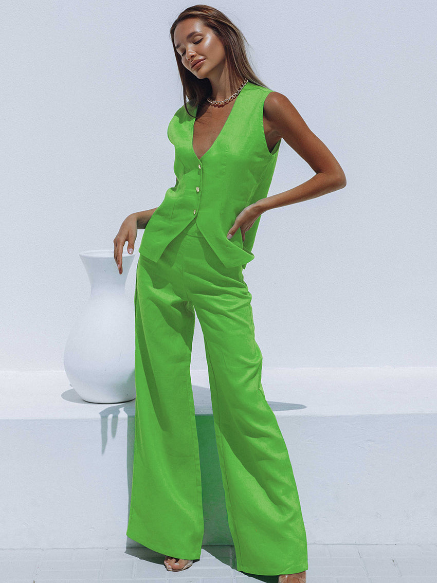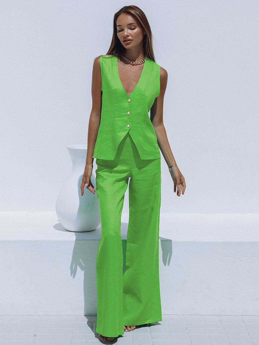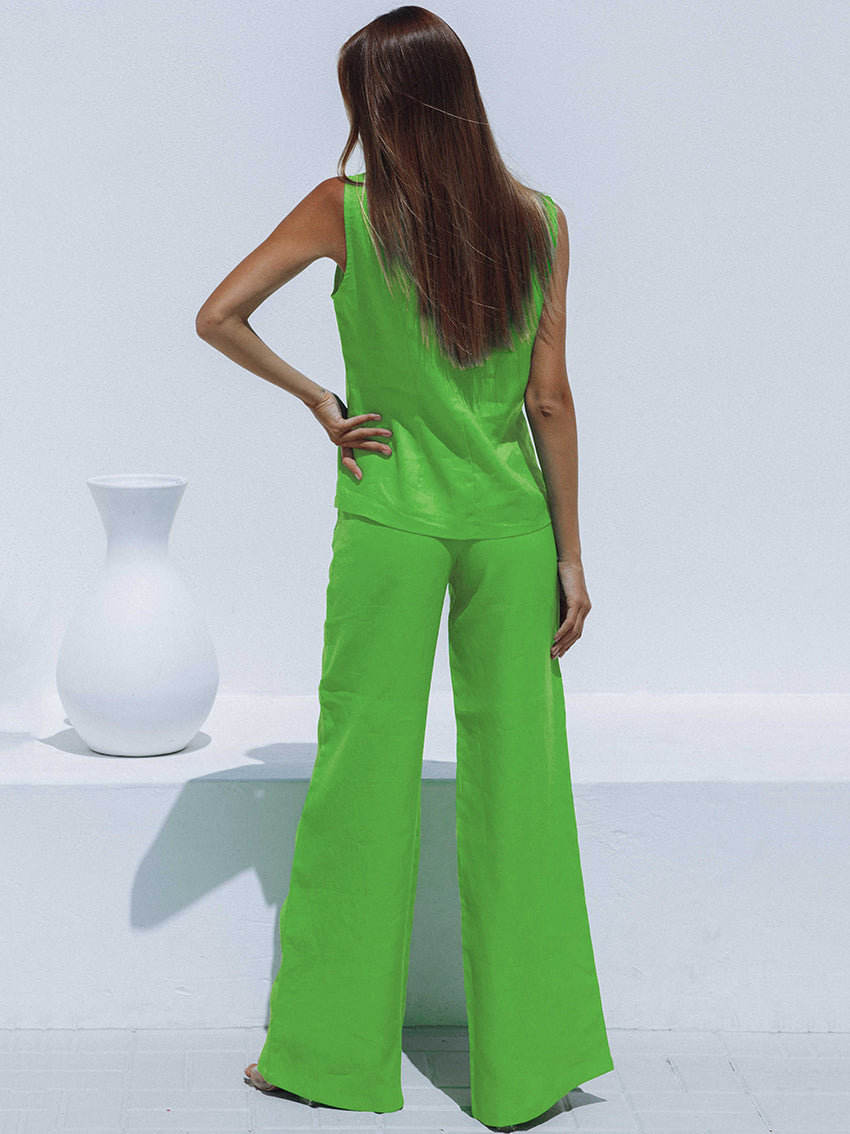 The perfect summertime outfit is here! This set includes a sleeveless tank top and wide leg pants with an elastic waist closure. The tank top is solid and v-neck, perfect for a breezy summer day. The pants are made of cotton and are wide legs. This set is perfect for a summer BBQ or family reunion.