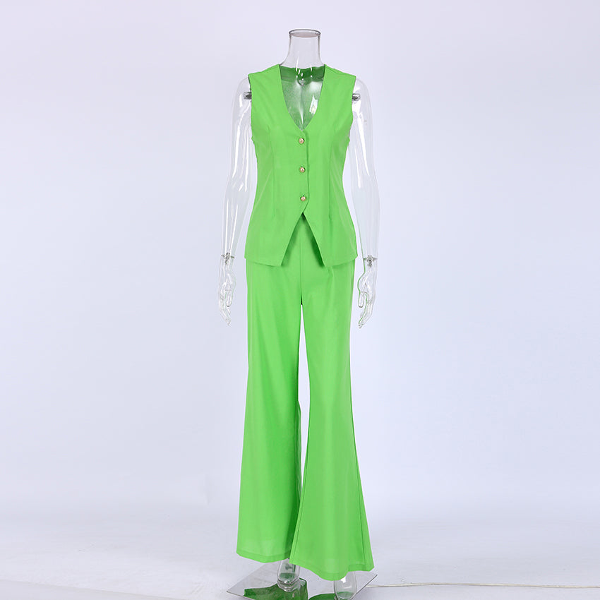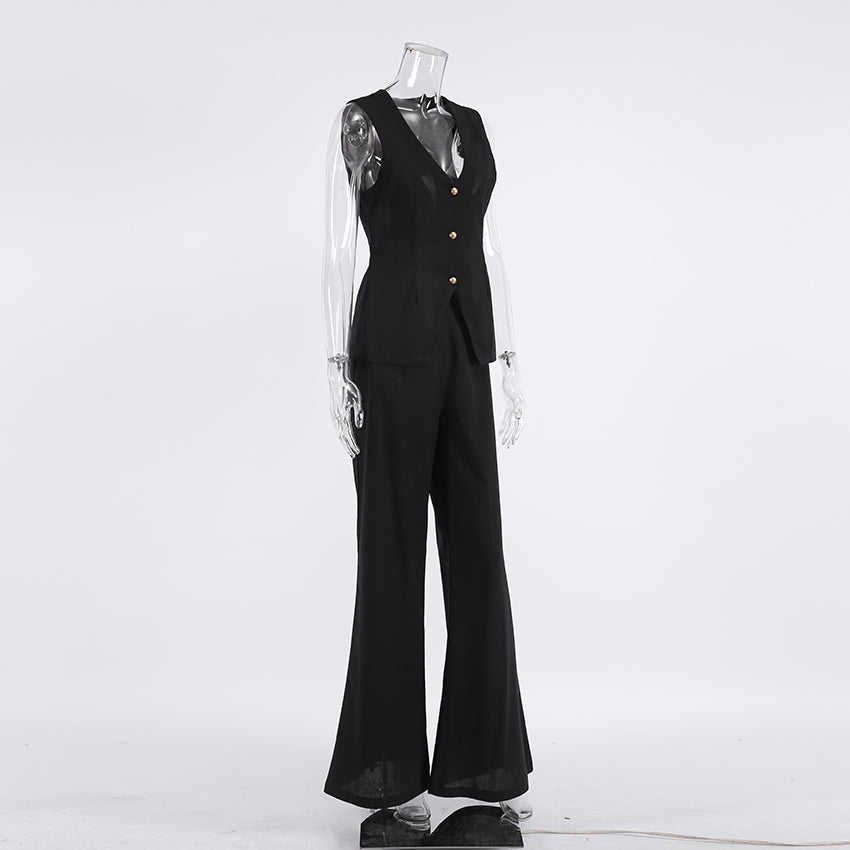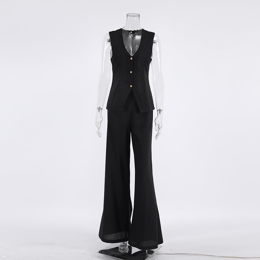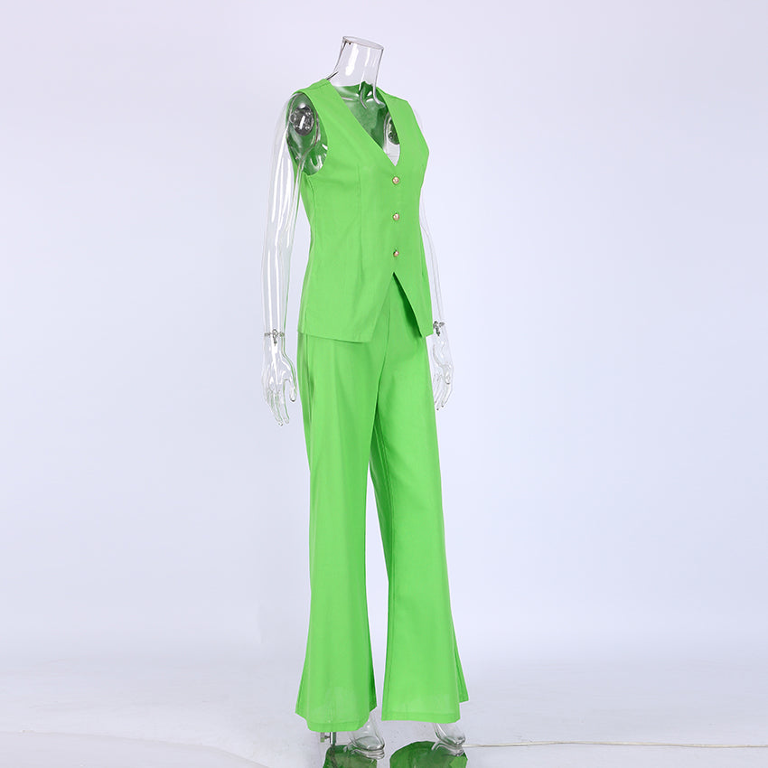 The perfect summertime outfit is here! This set includes a sleeveless tank top and wide leg pants with an elastic waist closure. The tank top is solid and v-neck, perfect for a breezy summer day. The pants are made of cotton and are wide legs. This set is perfect for a summer BBQ or family reunion.