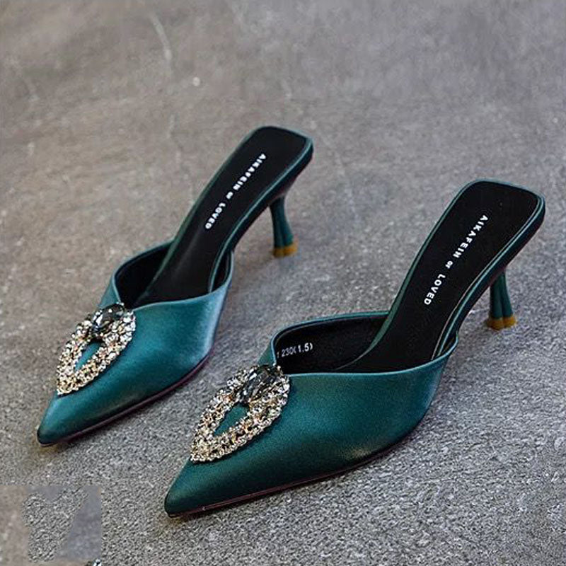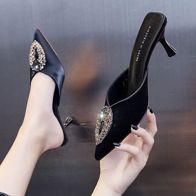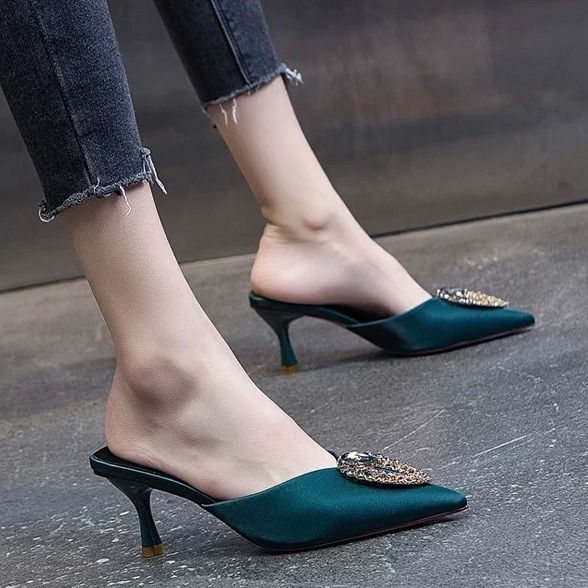 You'll feel like a goddess in these sophisticated, yet comfy pump mules. The silk material hugs your feet, with a pointed toe and thin heels. The metal appliques on the front of the shoe are the perfect detail to complete the look.