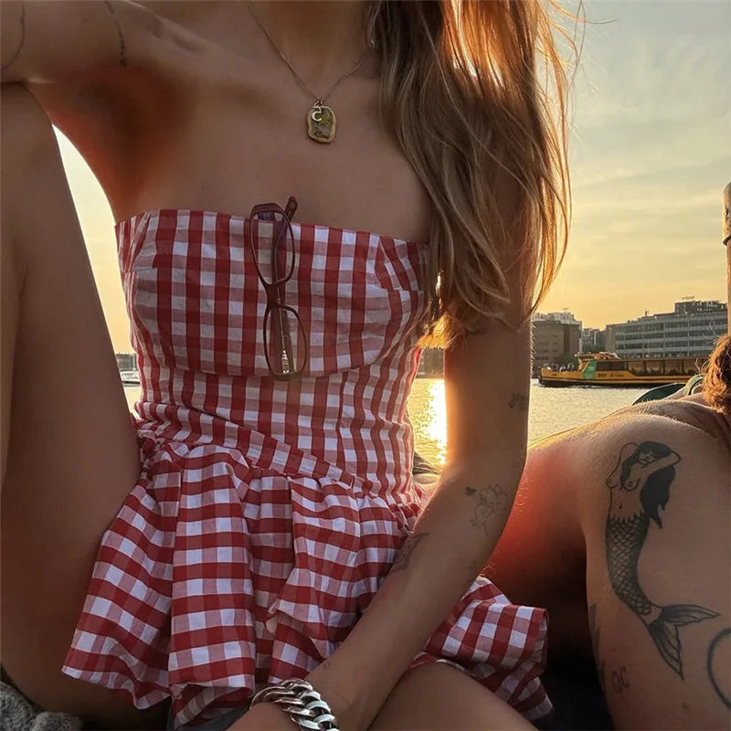 Unleash your inner dancer with our Dancing Disaster Blouse! Made with a blend of high-quality polyester and spandex, this lightweight and comfortable blouse will have you moving freely and stylishly. The trendy plaid pattern and strapless neckline add a touch of edgy sophistication to any outfit. Get ready to turn heads and dance the night away!