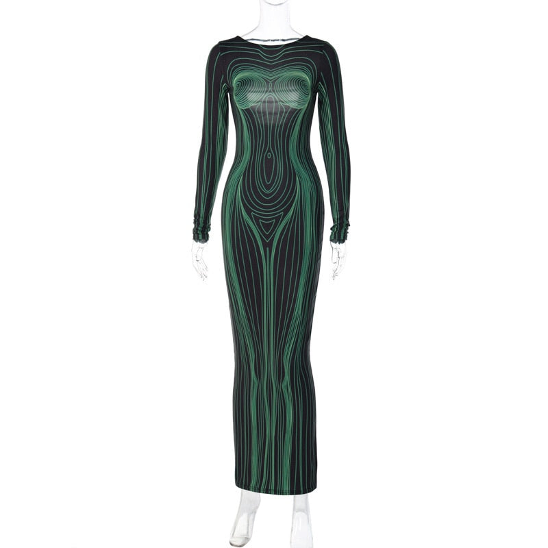 This long-sleeved maxi dress is a statement piece that is perfect for any occasion. The attractive green pattern is paired with a sexy neckline that features a flattering spandex material. Pair with a wide range of accessories to complete this flattering look.