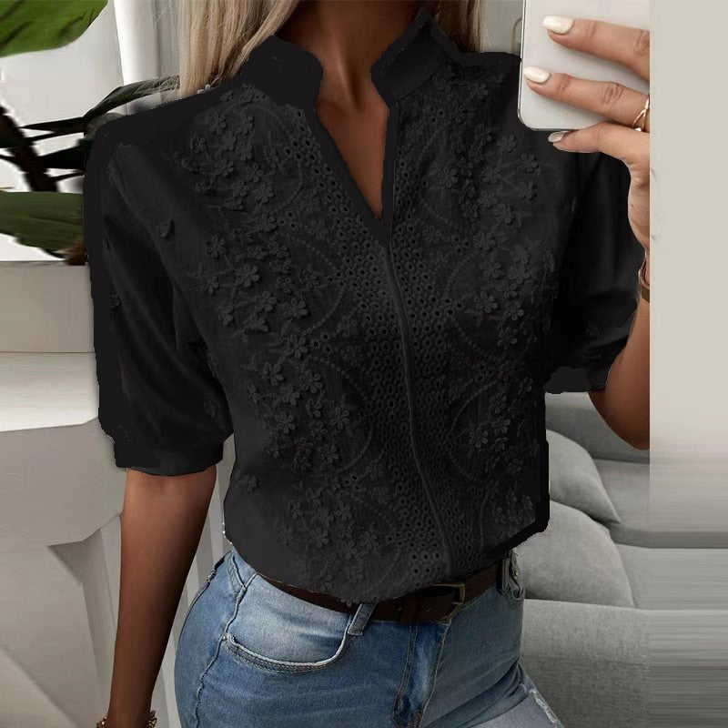 This stylish shirt is the perfect piece for your wardrobe. Made of cotton, this off-the-shoulder top is designed with delicate lace detailing along the v-neckline. Featuring a solid color, it is comfortable and versatile for multiple occasions.
