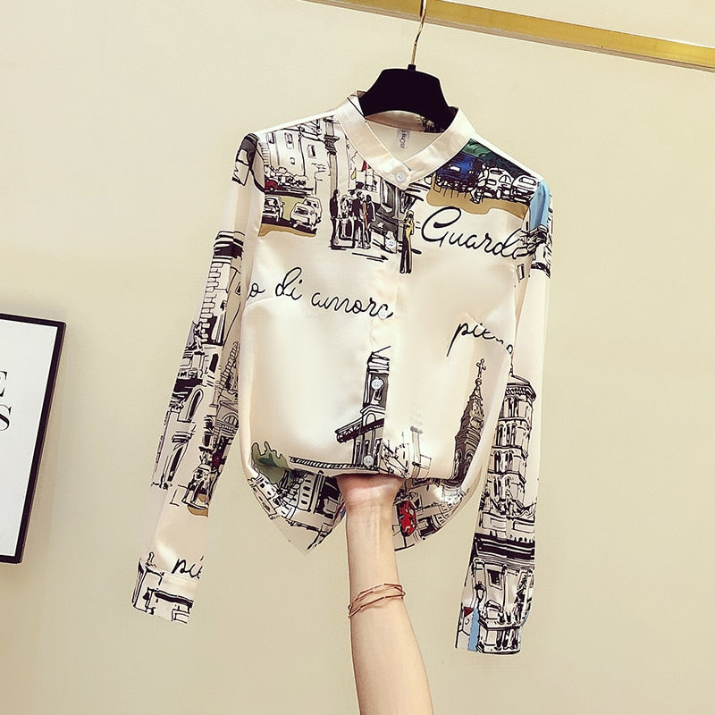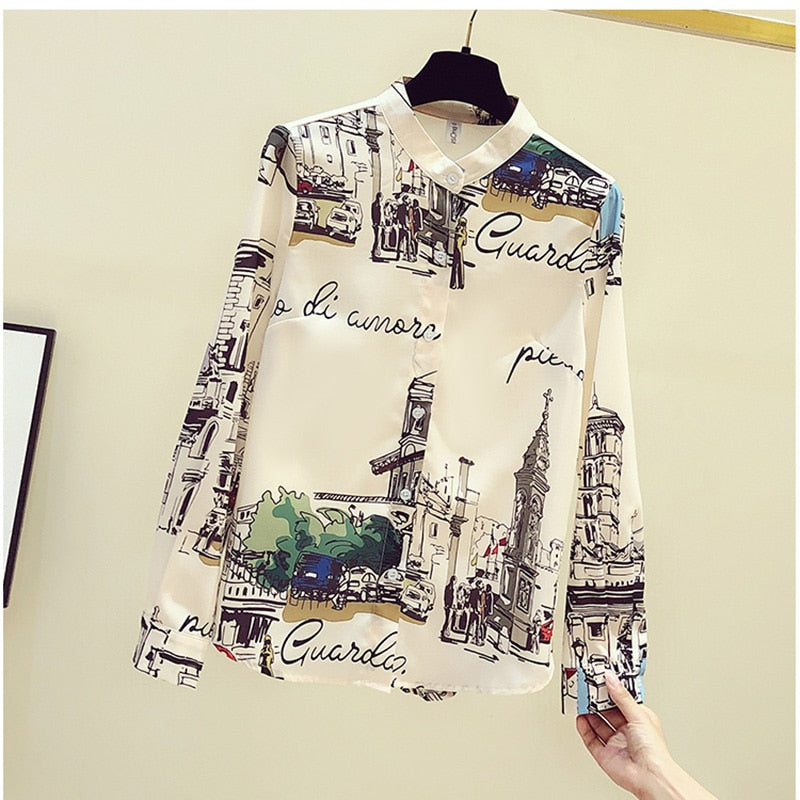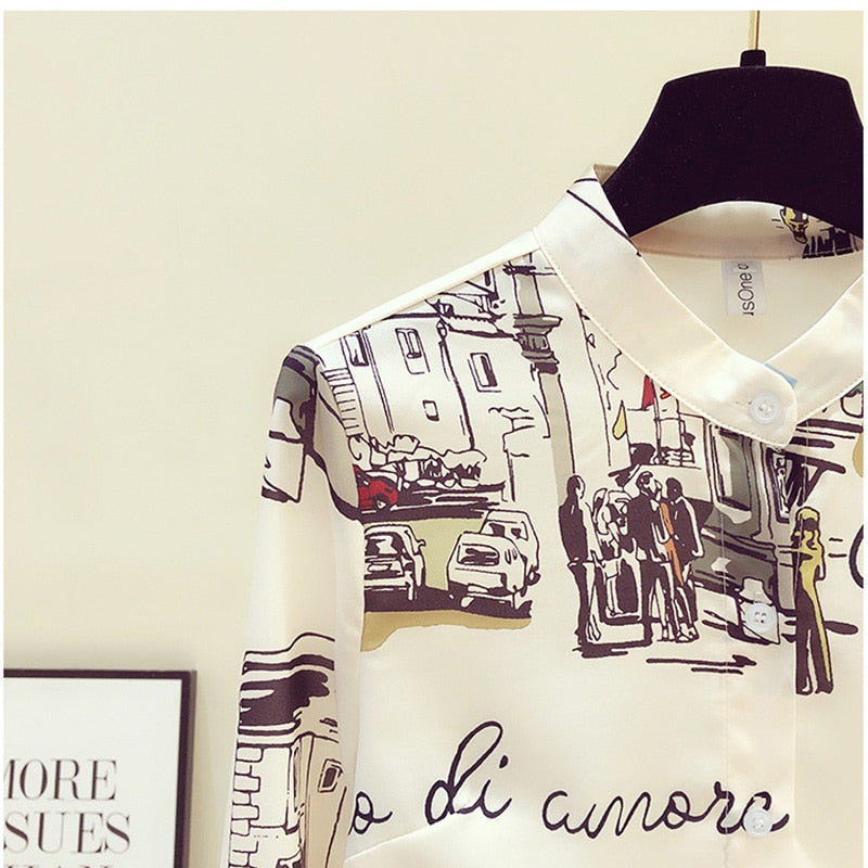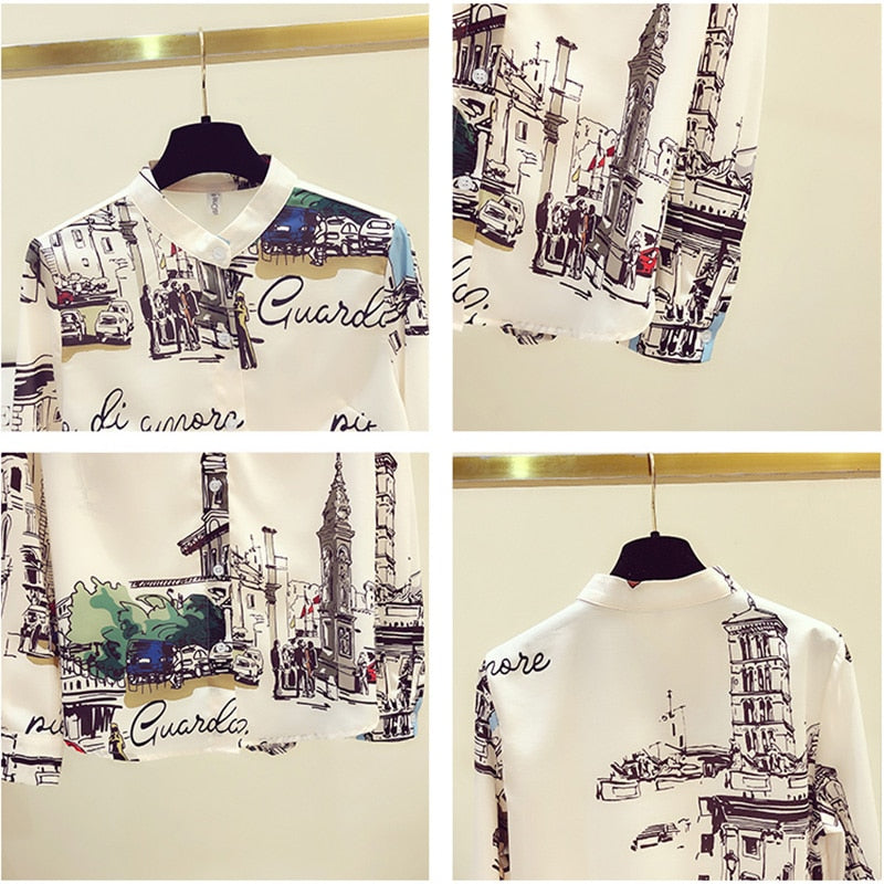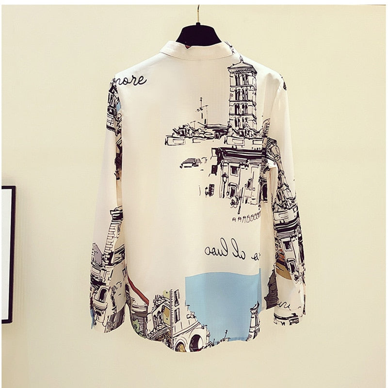 Long and Short Sleeve Polyester Shirt with Vintage City Pattern and Fruit Pattern