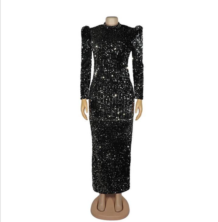 This black maxi dress is made of spandex and has full sequins, a puff long sleeve, and an o-neck. The shining sequins and fabric will make you stand out in any crowd.