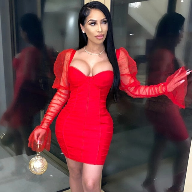 Elegant Solid Mesh Puff Sleeve Women Bodycon Mini Dress