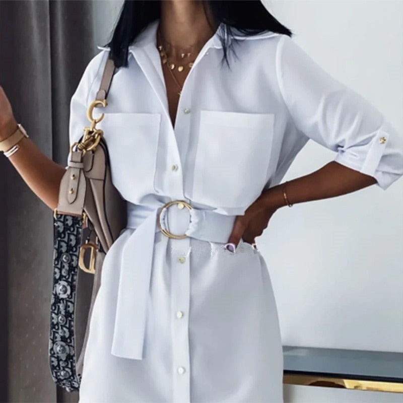 Shirt Style Mini Dress with Half Sleeve, Pocket, Turn-Down Collar, and Sashes Decoration