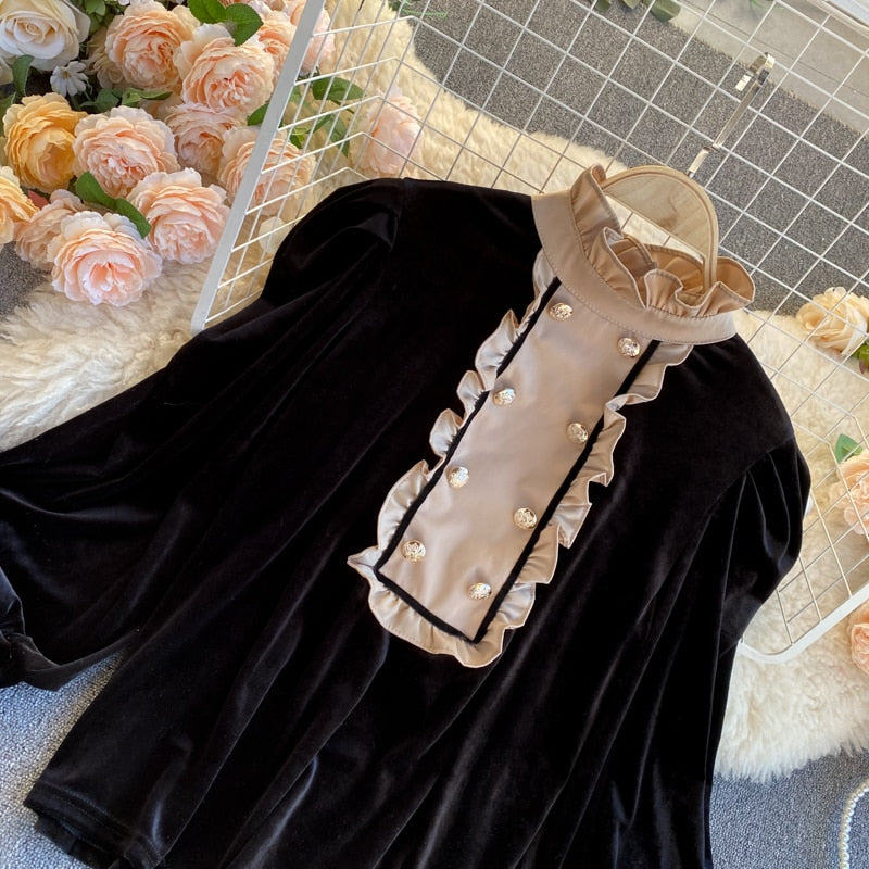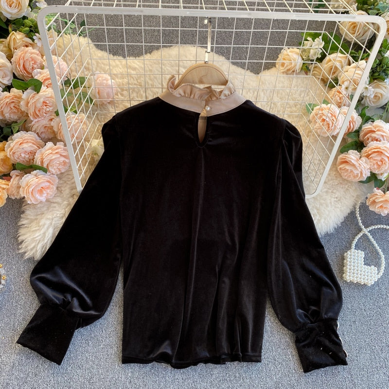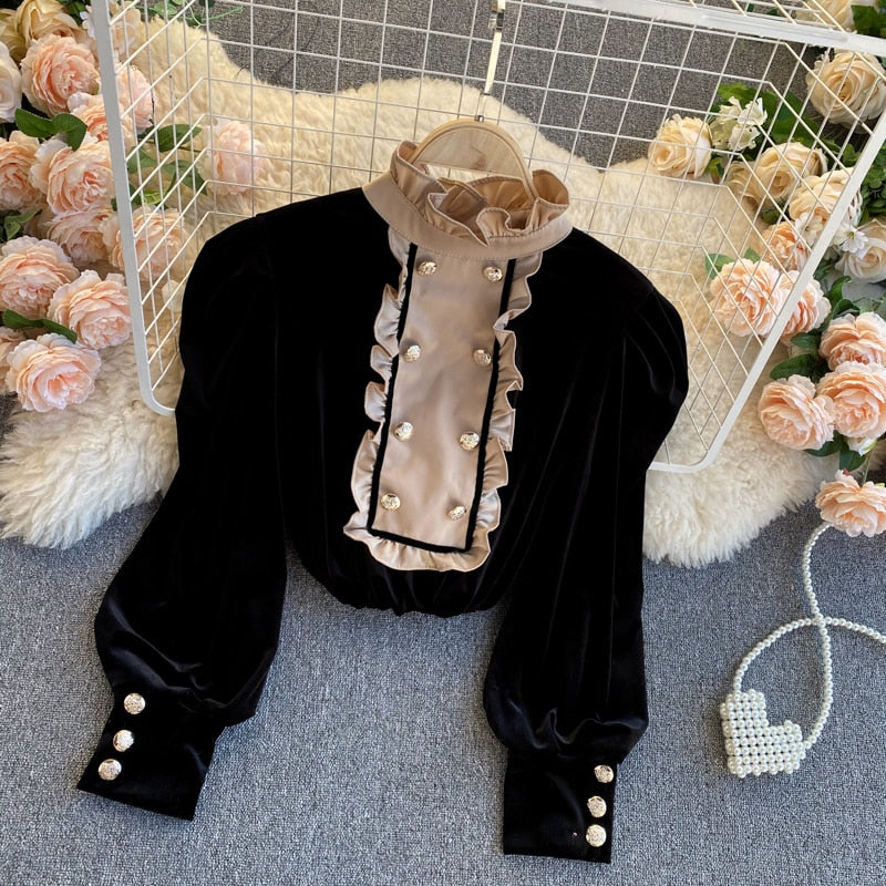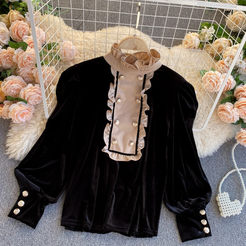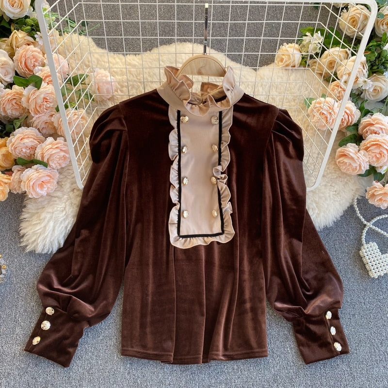 This blouse is a must-have for any woman's wardrobe. It features a delicate puff lantern sleeve, ruffles, stand collar. Available in 2 colors, this blouse is versatile enough to complete a variety of outfits.