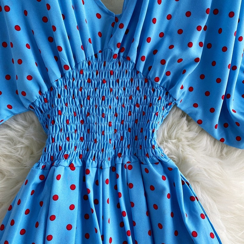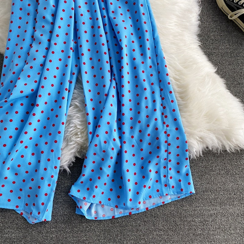 This polyester jumpsuit features a short-sleeved design with flaring pants, a v-neck, and an elastic empire-style waist. It is available in various colors and features a classic polka dot pattern. This eye-catching look is designed with a twist: a bright and cheerful pattern artfully fused with a comfy, breathable fabric. It's sure to draw attention wherever you go!
