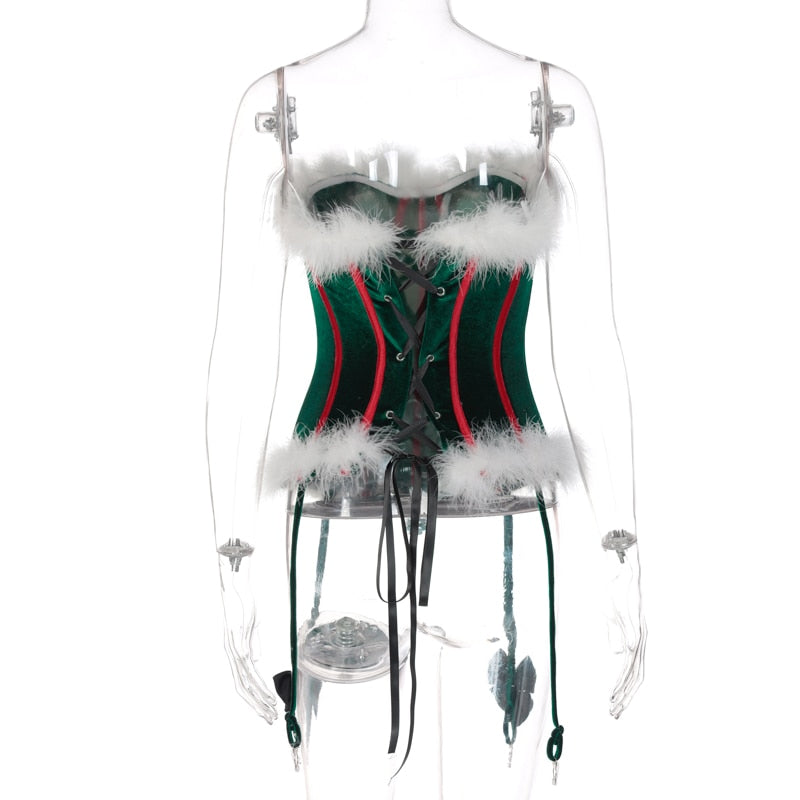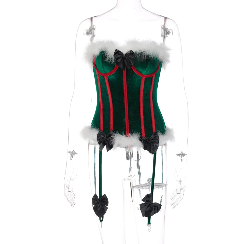 This lovely green camisole is decorated with a red stripe line, bow, and faux fur that gives it a stylish and elegant look. It's made of a soft and comfortable fabric that feels great next to the skin.