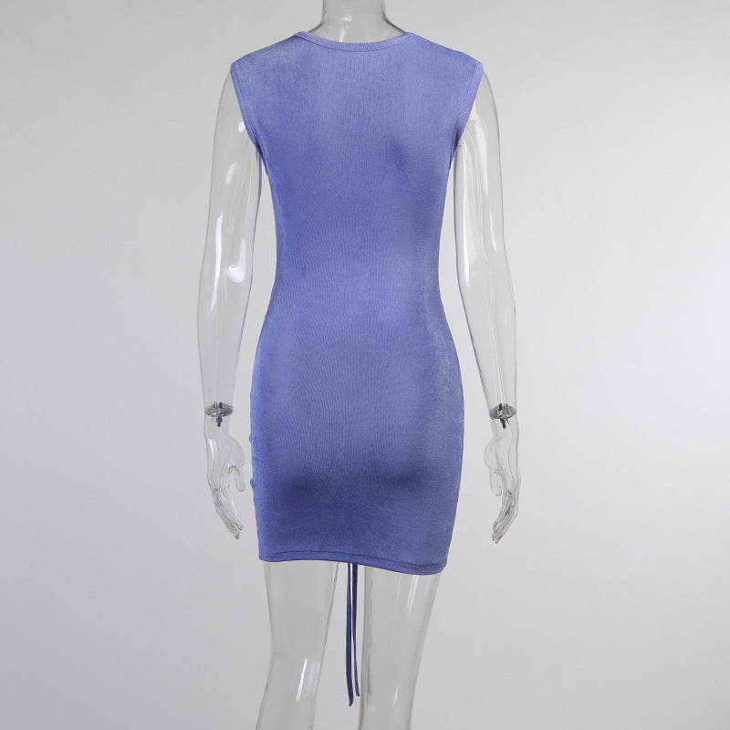 Sleeveless Mini Dress with V Neckline, Ruched, and Drawstring Decoration