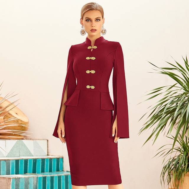 Solid Back Zipped-Up Polyester Spandex Midi Dress with Cape Sleeves Style and Oriental Button Decoration