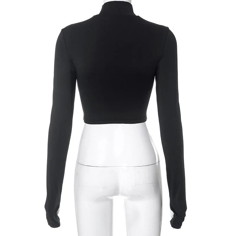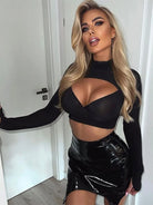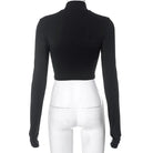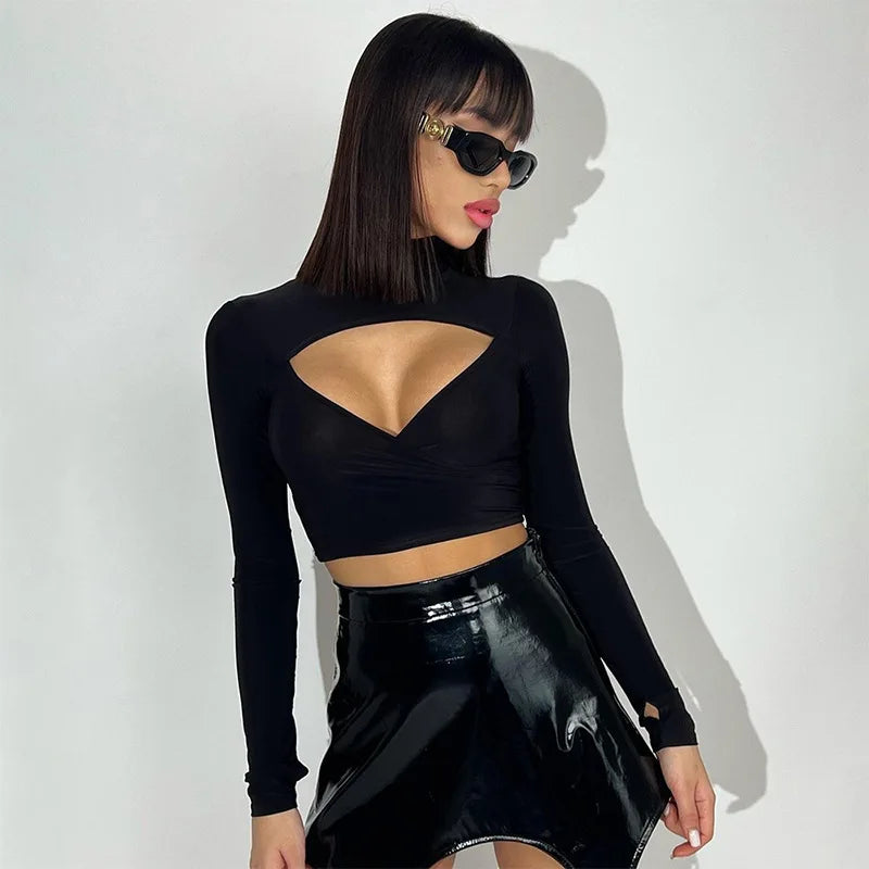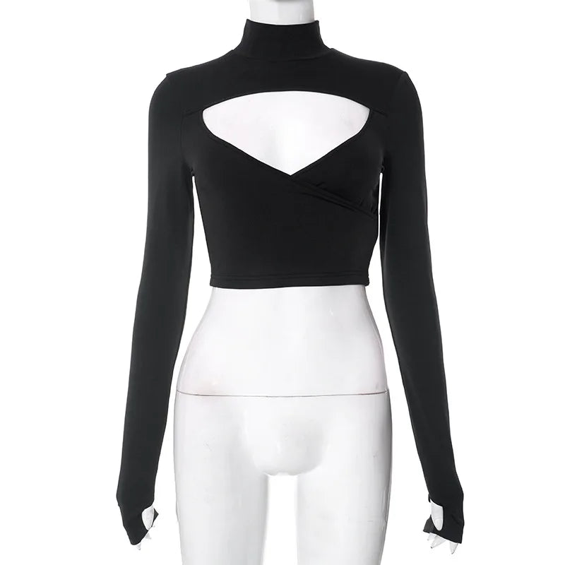 Elevate your wardrobe with this striking hollow out long sleeve crop top. Featuring intricate cutout details along the sleeves and torso, this piece combines edgy sophistication with contemporary style. The fitted silhouette flatters your frame while the long sleeves provide coverage with an artistic twist.