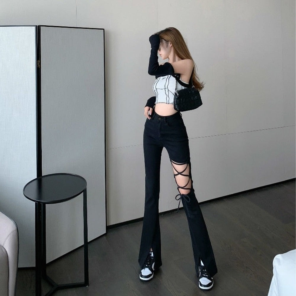 Flare jeans with a high waist and flattering cut serve up a sassy look that's sure to make a statement. This fashionable pair of women's jeans is a great way to add an instant edge to any outfit. The classic hollow-out design adds a touch of fashion to any outfit.