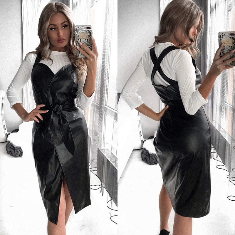 V-Neck Solid Midi Dress with Sashes Decoration and PU Material