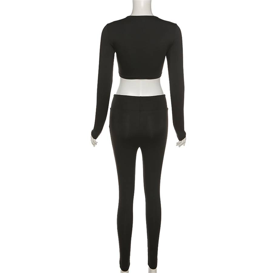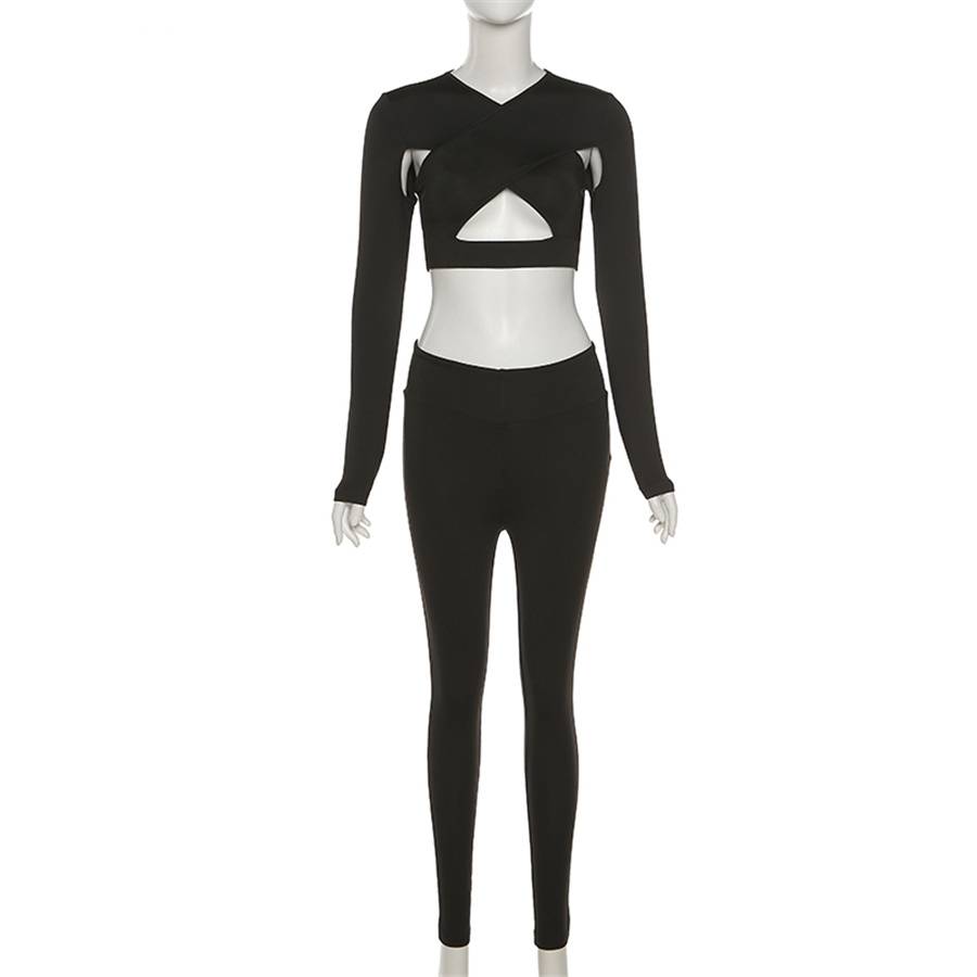 This cute and trendy outfit offers a fun new style option for active women to enjoy. This outfit is a fashionable way to stay active in comfort and style. The long-sleeved top offers additional coverage and the full length-pants are convenient for on-the-go activities. The criss-cross design allows for complete freedom of movement without feeling constricted. Let's get active in a fun and stylish way!