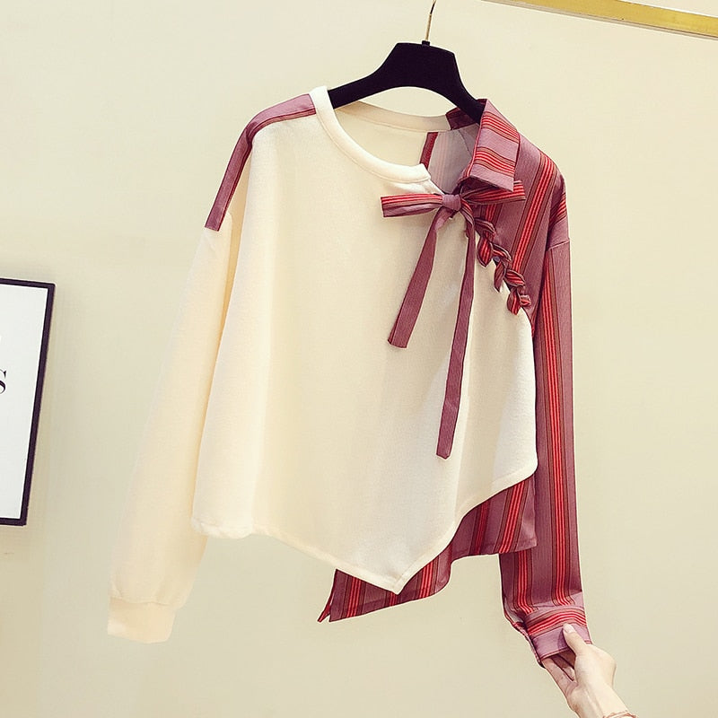 Long-Sleeved Polyester Blouse with One Plaid Stripe Patterned Patchwork Style Sleeve