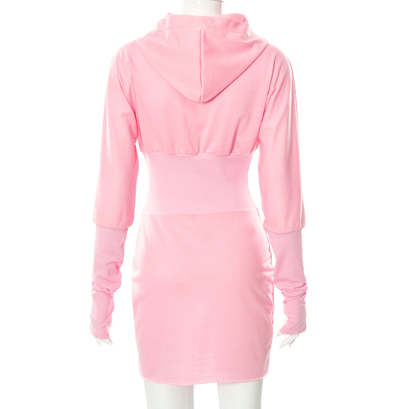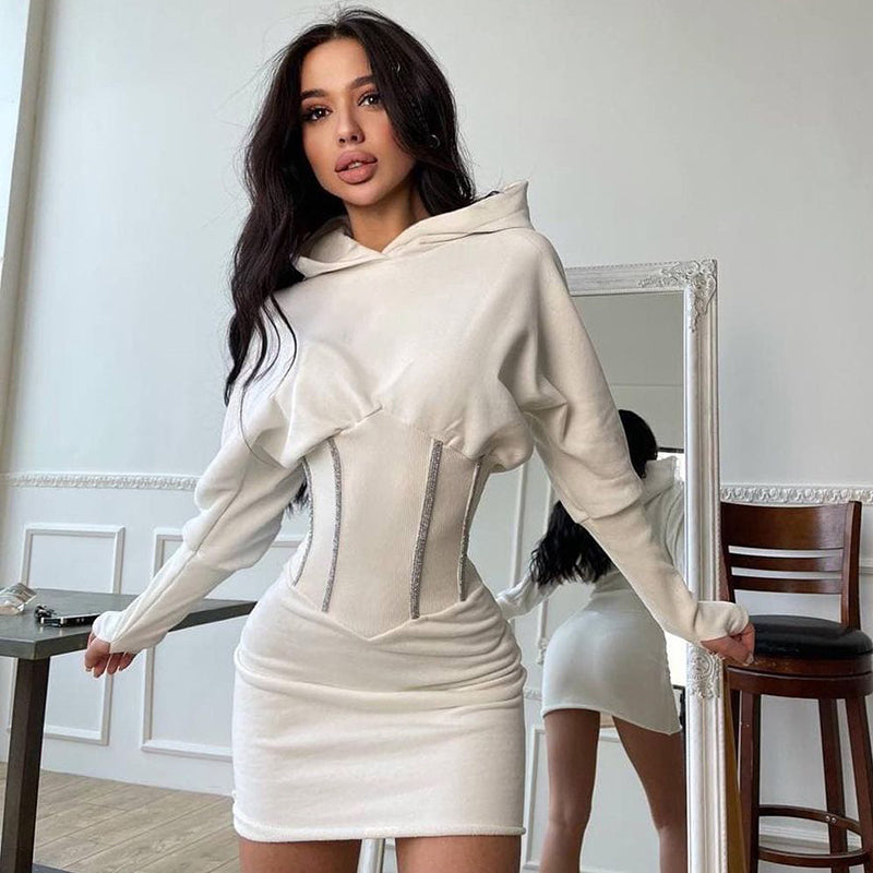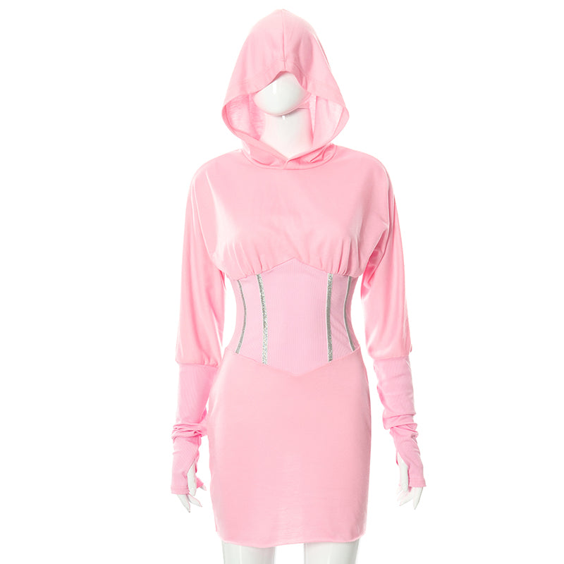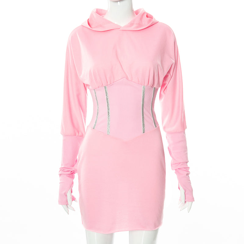 This is a casual dress look that you can wear for any occasion. This is a dress which has a hoodie and long sleeves. It also has a corset-style empire waist to give you that edgy look.