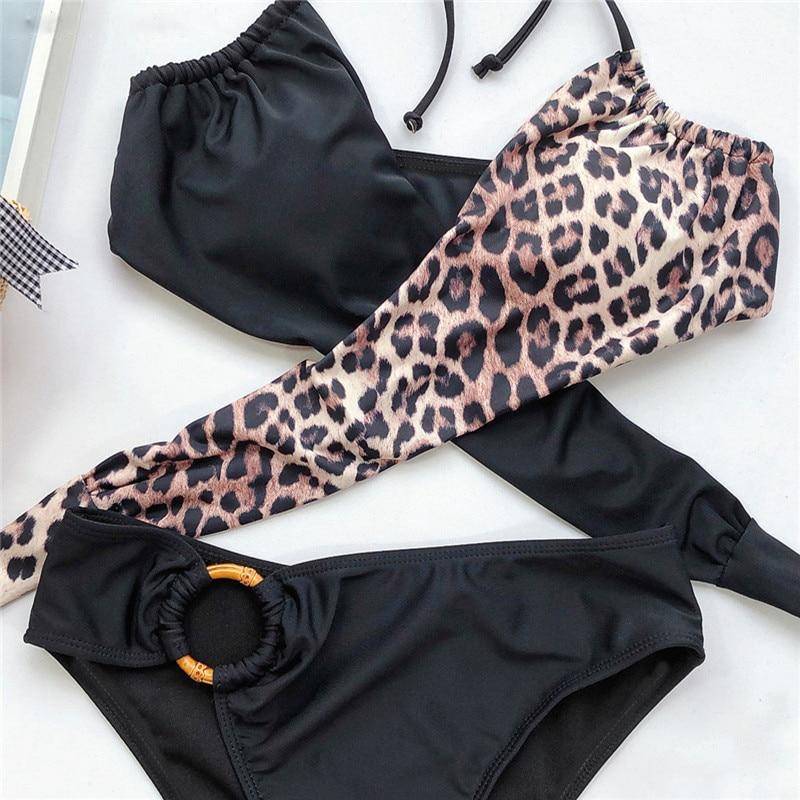 Two-Piece Halter Bikini with Ring Decoration and Nylon Material