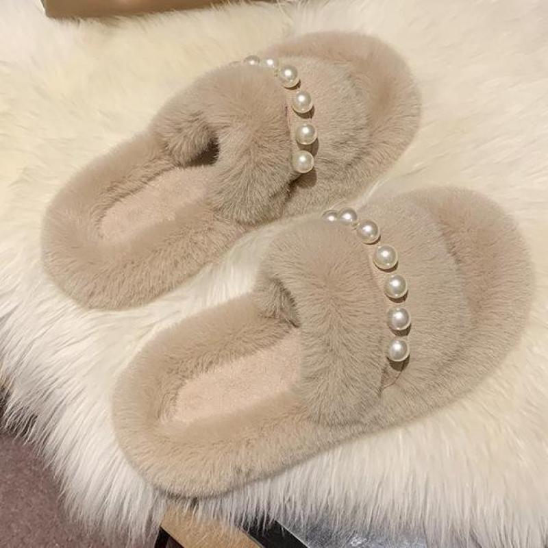 Solid Fur Slipper Sandal with Pearl Decoration, Fleece, Flock, Rubber, and PU Material