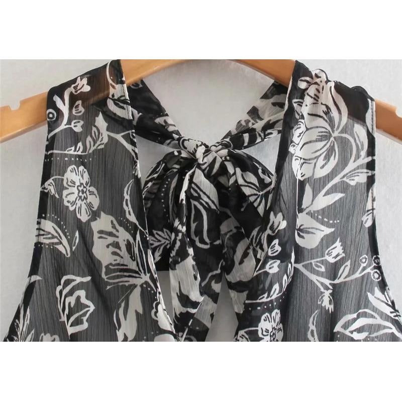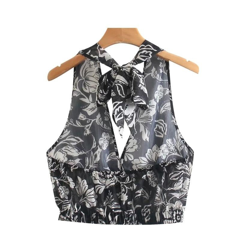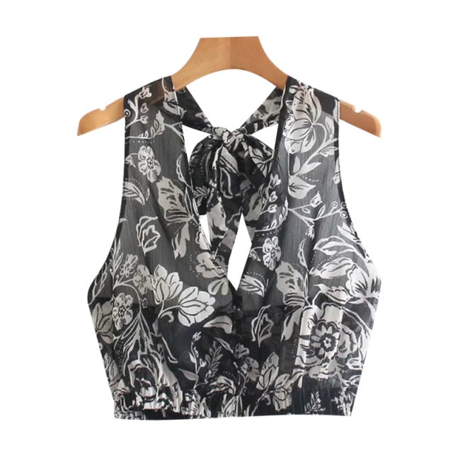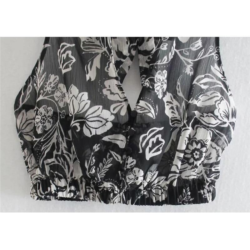 Sheer Sleeveless Crop Top with Floral Pattern, V-Neckline, and Chiffon Material