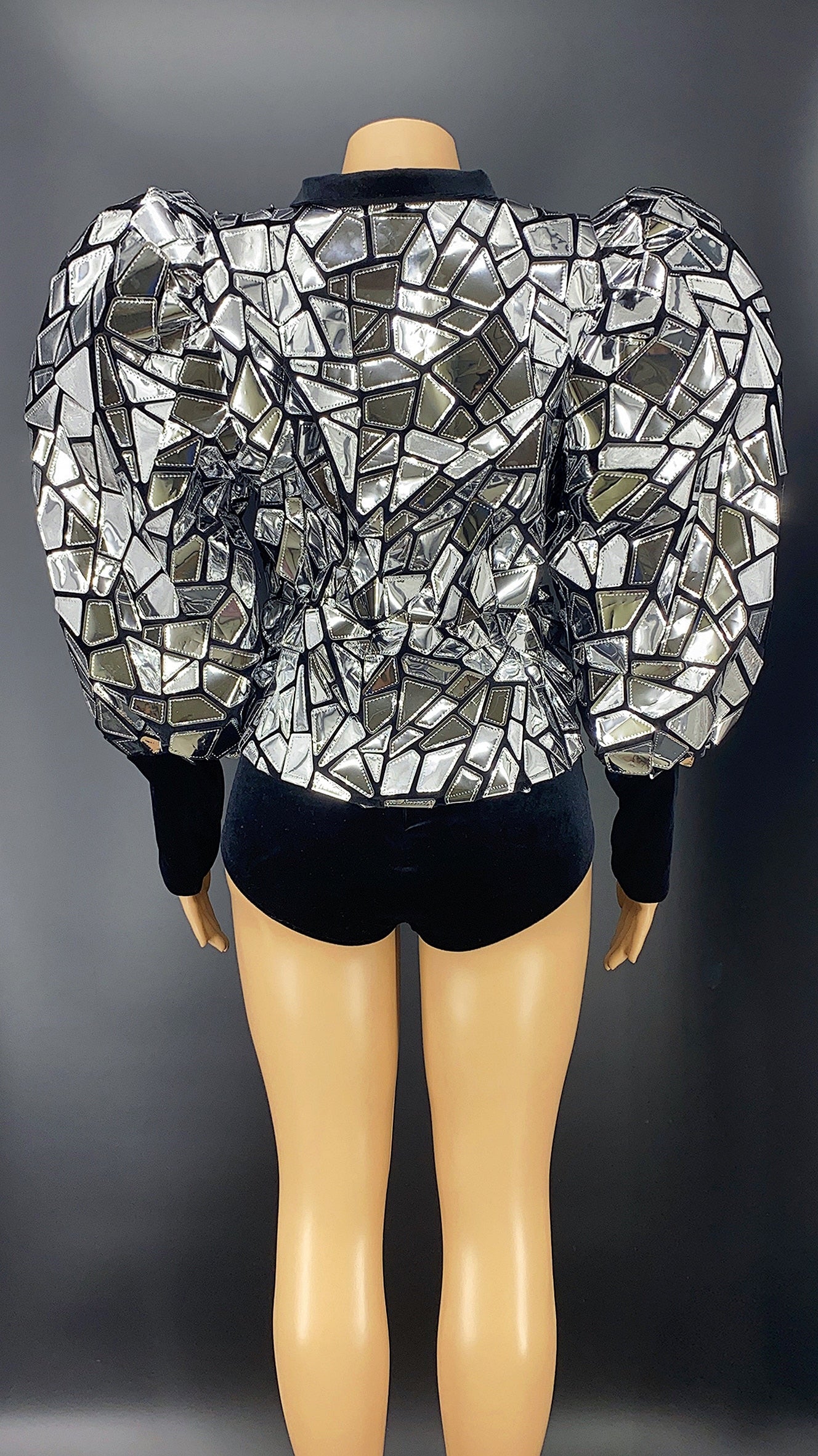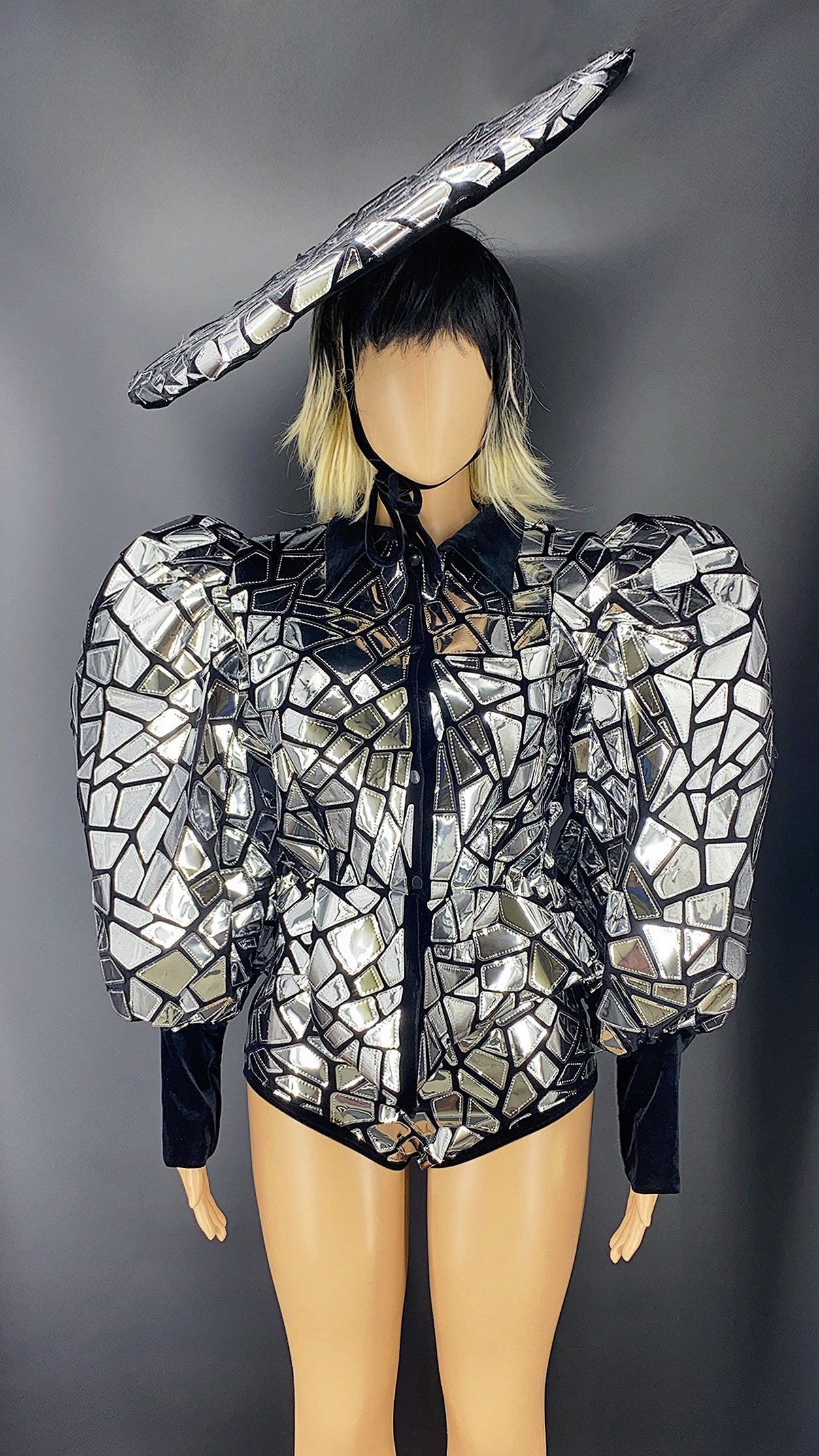 This unique bodysuit is ensured will add a touch of fun. The long puff sleeve and mosaic pattern in hologram color make it perfect for stage performance. The turn-down collar and zipper closure at the front give it classic look.
