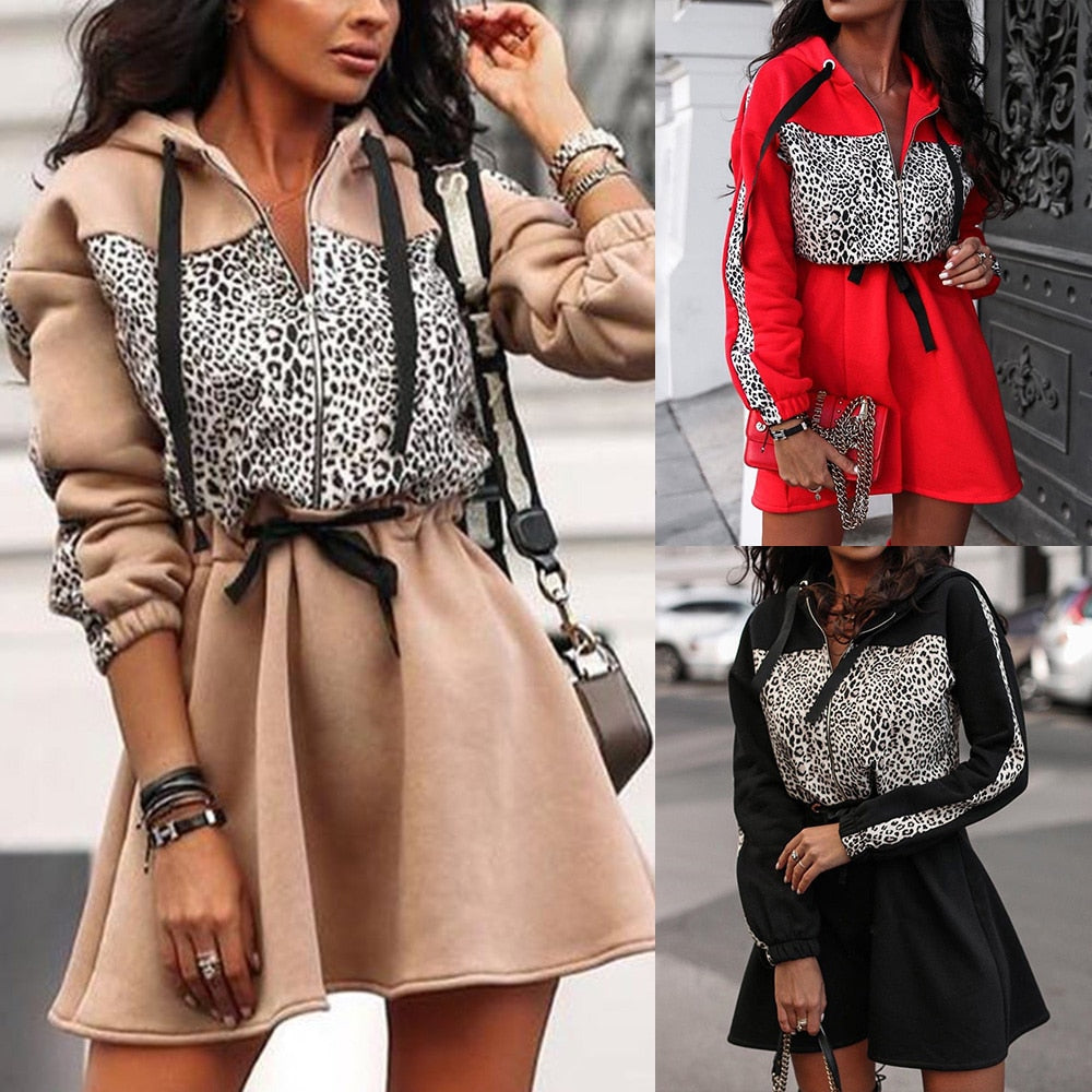 Casual Mini Dress with Leopard Pattern, Hooded Neckline, Long Sleeve, and Polyester Material