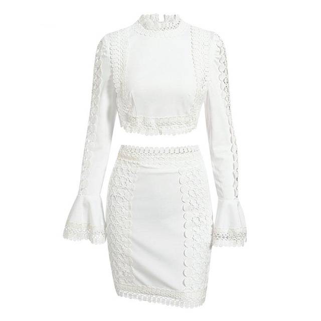 Lace White O- Neck Flare Sleeve Women Two Piece BodyCon Midi Dress